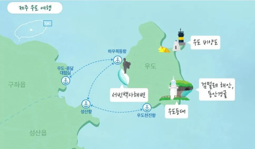 우도를 걸어서 돌아보려면 4~5시간이나 걸리고 많은 체력이 소모되므로 자동차나 섬 순환 버스 등을 이용하여 주요 관광지를 돌아보는 것이 좋다. 요즘은 자전거나 미니 전기차를 빌려서 또 다른 재미를 더하며 우도를 즐기는 사람들이 늘고 있다.