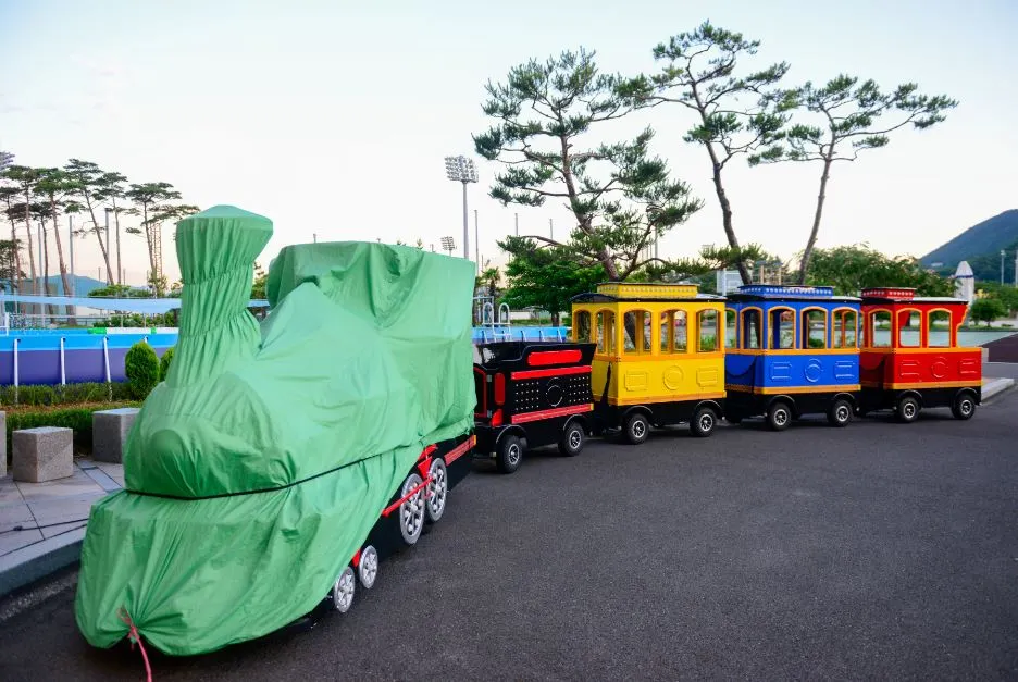 환경조각길에 전시되어 있는 조각품 중 하나와 해안길을 운행 중인 꼬마 열차