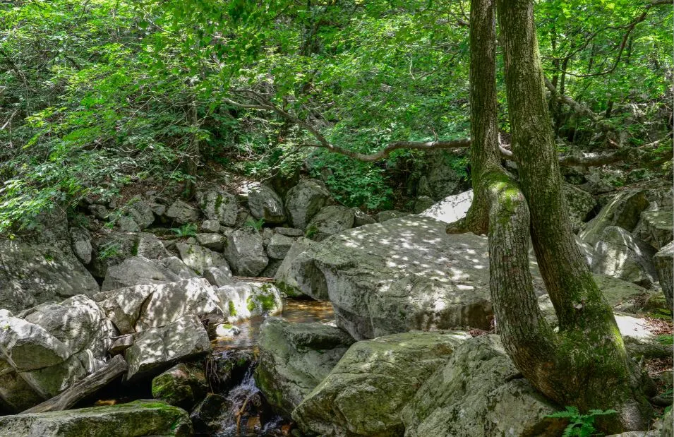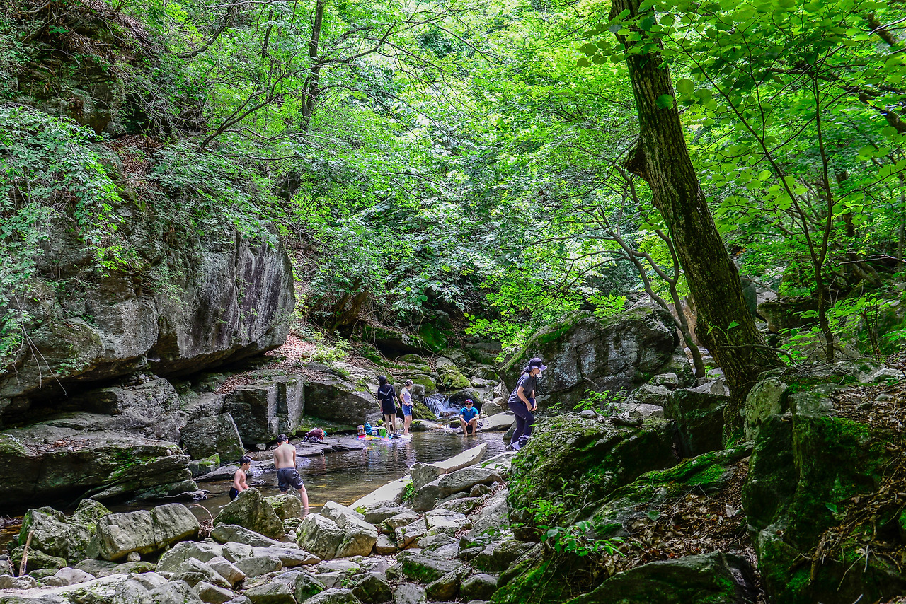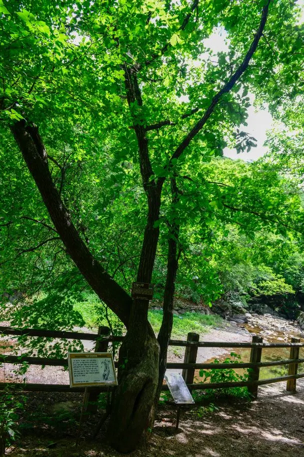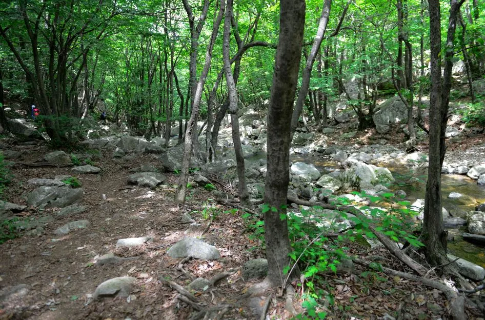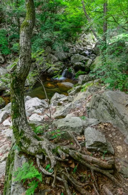 산꼭대기부터 굴러온 바위가 제멋대로 널브러진 계곡에 하필이면 바위에 뿌리를 내려버린 나무들은 위태롭게 바위를 감싸 안은 채 살아가고 있다. 물소리 때문인지 더욱 상큼해 보이는 푸른 이끼와 울창한 숲 사이로 스며든 햇살 덕에 울창한 숲이 한층 싱그럽다.