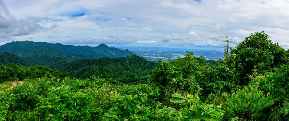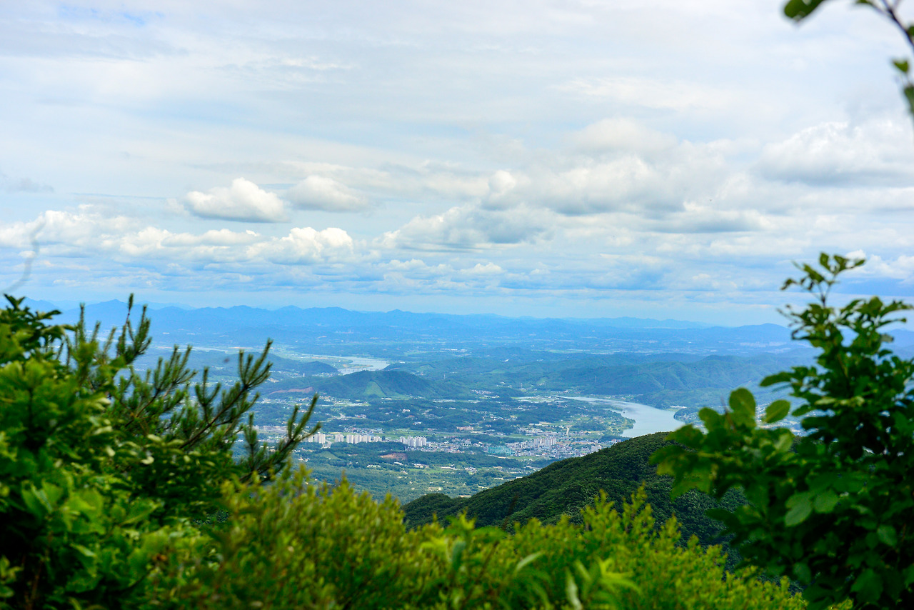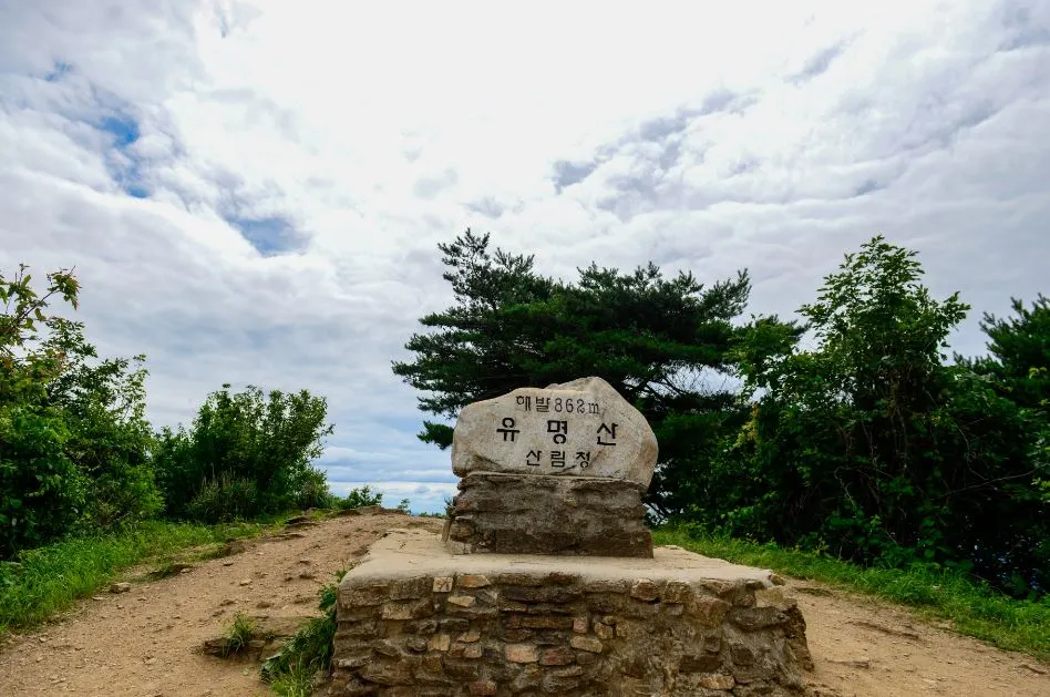 합수지점에서 하늘이 보일 듯 말 듯 이어지는 S자 길을 1.6킬로미터나 가서야 유명산 정상에 도착하였다. 울창한 나무들 때문에 전망대에서도 시원한 전망이 보이지는 않았으나 엇비슷한 높이의 소구니산 대부산의 짙푸른 등선이 병풍처럼 펼쳐진 모습이 장관이다. 이궁 어쩌다 보니 유명산 정상까지 오르고 말았다.