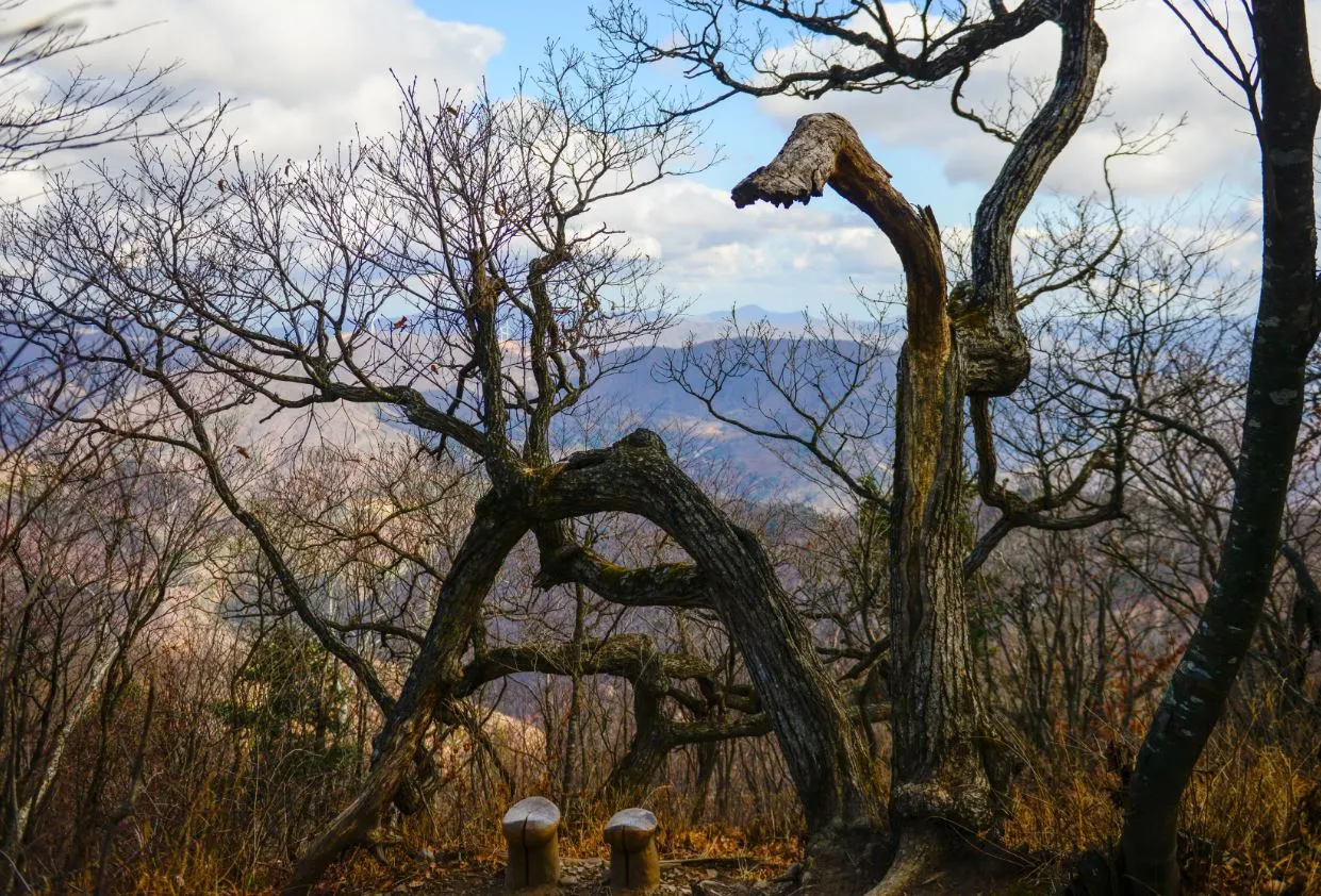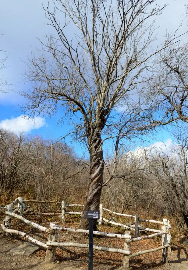 야광나무 속에 마가목 씨가 들어와 싹을 틔워 뿌리를 내린 뒤 서로 양분을 주고받으며 자라고 있다는 세상에서 유일한 나무 마유목. 단순히 뿌리나 줄기가 엉킨 연리지와 달리 뿌리부터 몸통까지 모두 한 몸이 되어 자라고 있다니 신기하기만 하다. 활처럼 휘어진 갈매나무를 지날 때는 누구나 허리를 굽혀야 하기에 겸손 나무라 한다.