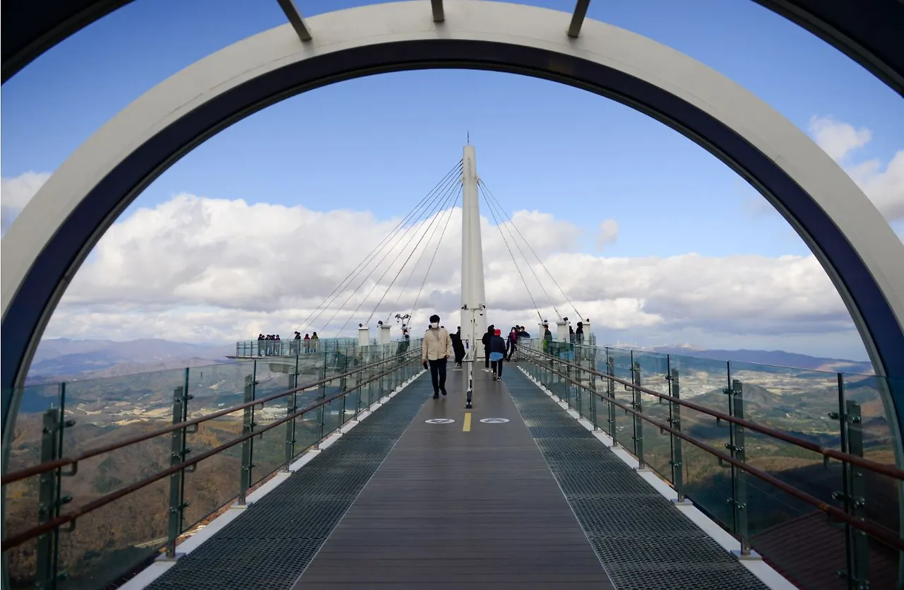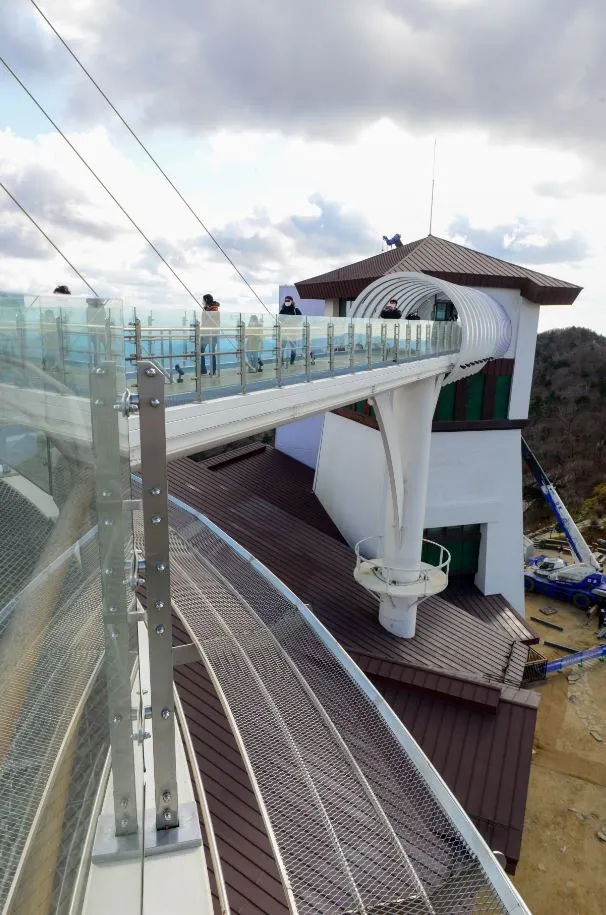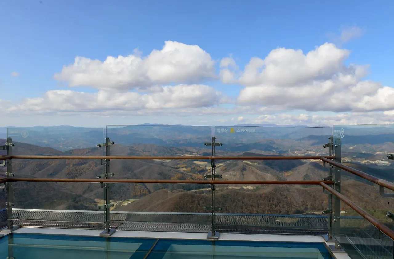 엘리베이터를 타고 올라간 스카이 워크에서는 발왕산과 저 멀리 백두대간까지 훤히 내려다 보였다. 뭉게구름이 바로 눈 앞에 또 높은 산봉우리들이 발아래에 있다. 우려했던 찬바람은 다행히도 잠시 멈춰진 상태라 편안하게 태백산맥의 장엄한 모습을 즐길 수 있었다. 특히 이곳은 동해에서 떠오르는 해와 백두대간으로 떨어지는 해를 모두 볼 수 있다고 한다.