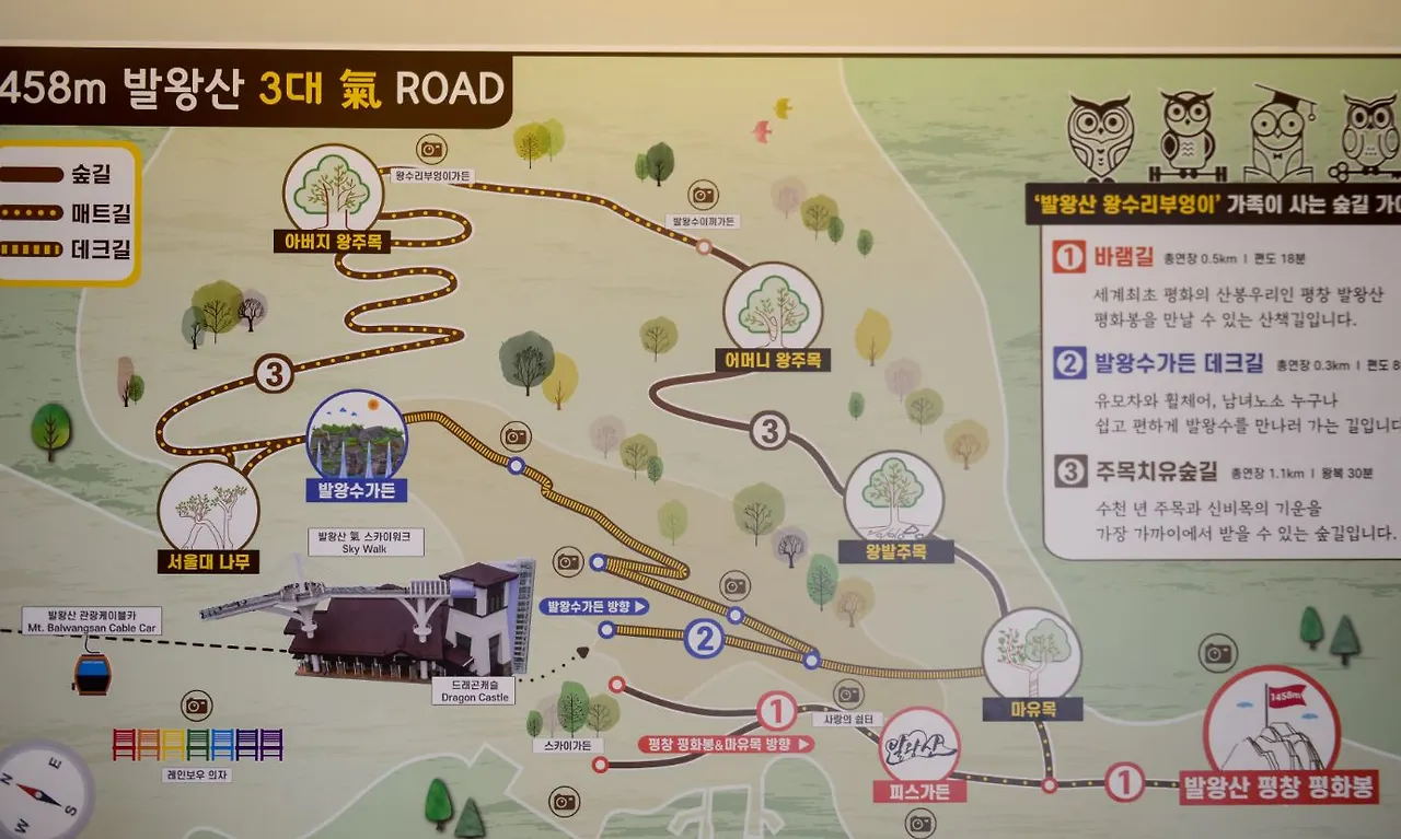 전망대부터 정상까지는 발왕수 가든부터 마유목등 독특한 나무를 보며 산책할 수 있는 등산로가 마련되어 있다.