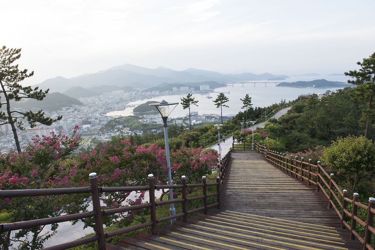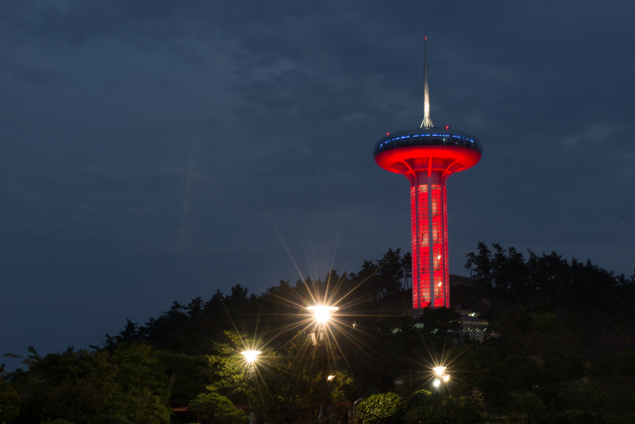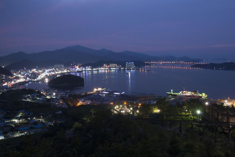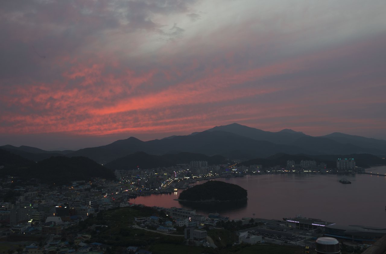 다음으로 찾은 곳이 완도타워. 전에 왔을 때 모노레일 공사 중이더니 완공되었다. 좀 전에 만난 아저씨 덕분에 중앙 통으로 차를 가지고 올라갔다. 전망대에서 내려다보는 전경은 차로 드라이브할 때 와는 그 감흥이 다르다. 타워 뒤쪽의 양식장에서는 벌써 일몰이 시작되고 있다. 완도항 전체가 붉게 물들고 있다.
