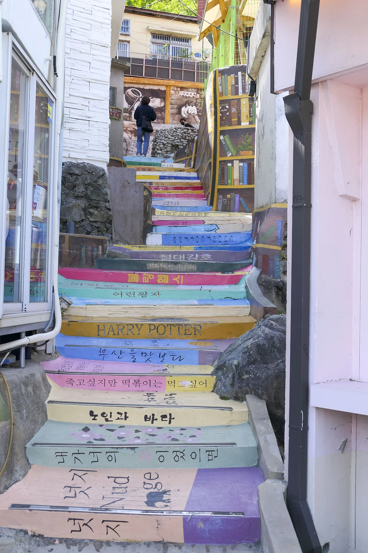 책으로 꾸며진 계단을 오르면 우물이 있다. 비슷하지만 다른 집(우리 동네 감천)