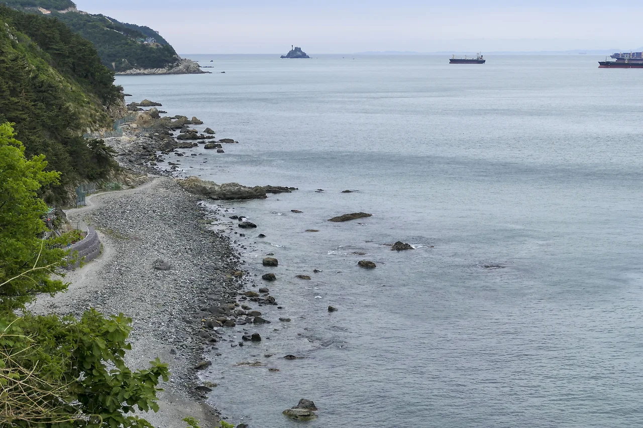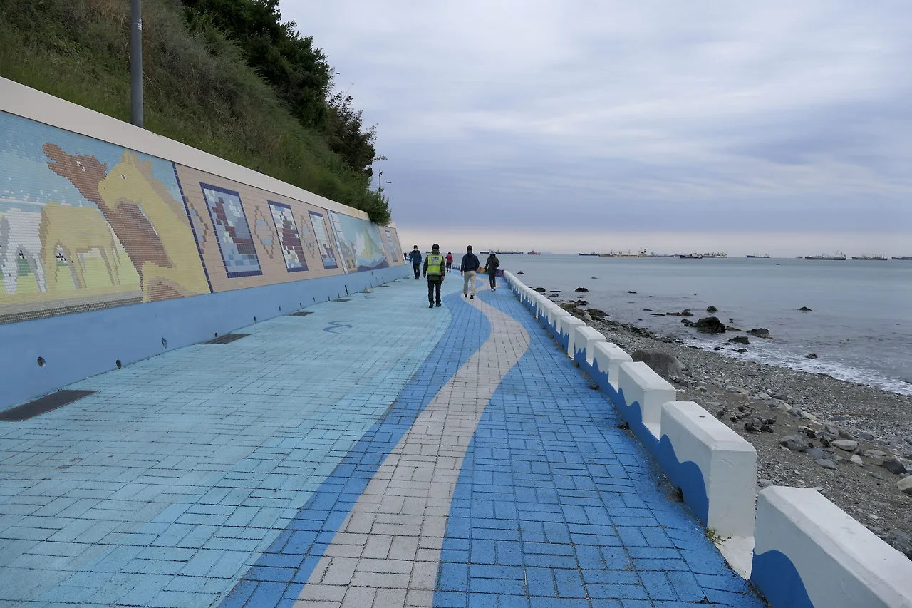 남항대교 아래 주차장부터 해안 터널이 있는 곳까지 이어진 길이 절영해안 산책로다. 멀리 수평선 아래 정박 중인 배들이 그려내는 잔잔한 바다 풍경과 해안선을 따라 이어지는 항구의 풍경이 신선하다. 싱그러운 바다 내음 맡으며 발걸음을 옮기다 보니 흰여울 해안 터널까지 1킬로미터 가까운 산책길이 짧게만 느껴진다. 길바닥이 시멘트인 것이 다소 아쉽기는 했지만 길게 물결치듯 그려진 곡선이 인상적이다.