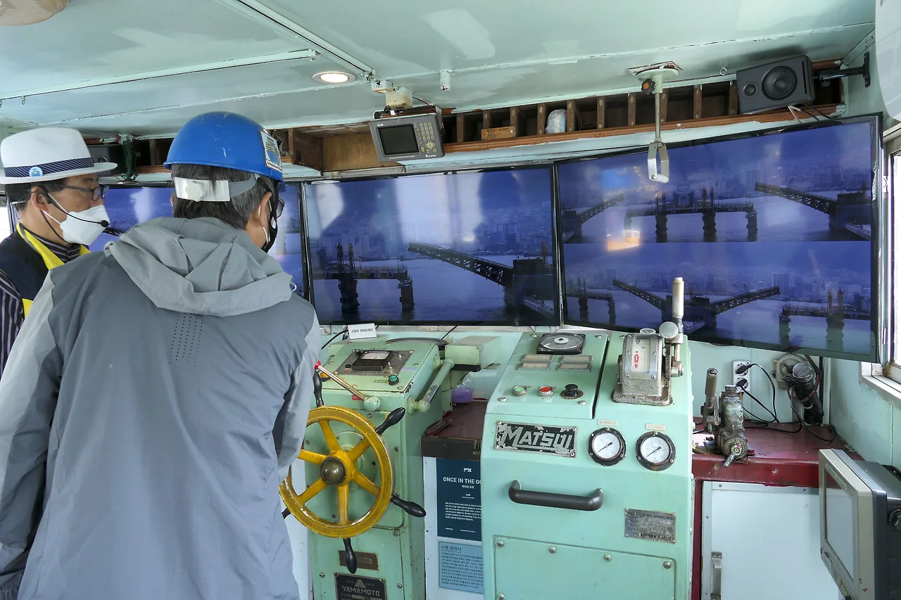깡깡이 도구 체험 밎 실제로 배의 엔진을 돌리다보면 영도다리가 열리고 태평양까지의 영상이 나와 실제로 배를 운전하는 것 같은 느낌이 든다.