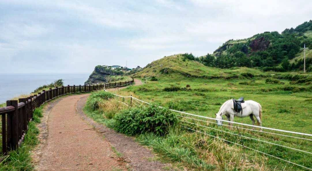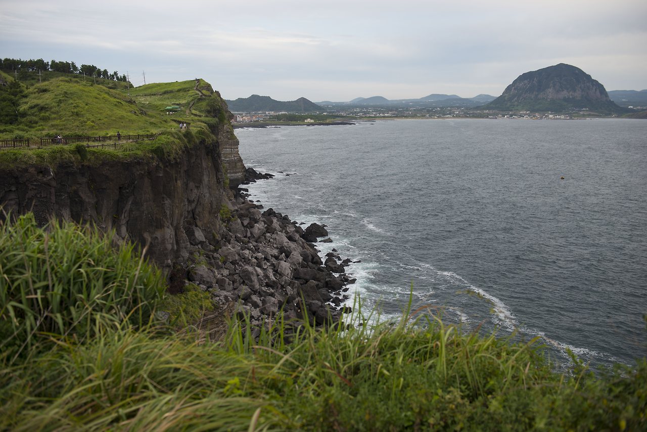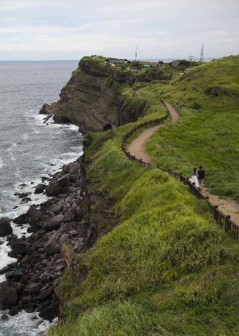 송악산을 오르는 산책길 왼쪽 바다로 내려다 보이는 산방산과 형제섬은 한라산과 어우러져 또 다른 그림을 그려내고 있다. 발아래 보이는 유람선은 마라도로 가는 배일까? 배가 떠나자 소란스럽던 소음이 잠시 잦아든다. 푸른 녹지와 넓은 바다 사이의 오솔길, 절벽 아래를 부숴버리기라도 할 것처럼 수없이 파도가 밀려든다. 잠시 난간을 잡고 내려다보다 그 깊이에 현기증이 난다. 길가에 매여진 말은 관광객들의 승마 체험을 위한 말인 듯 하나 한가롭게 풀을 뜯고 있다.