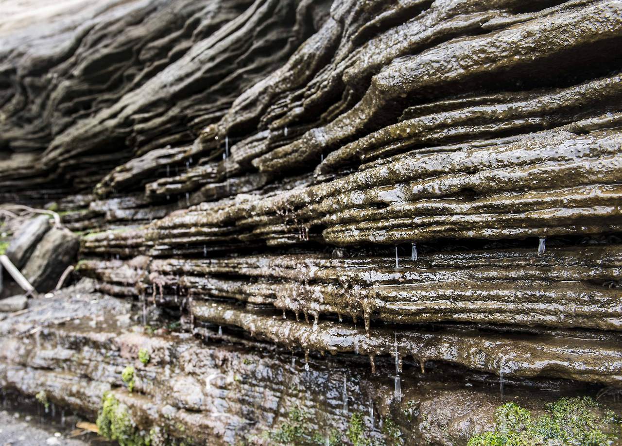 바람과 파도 그리고 세월이 만들어 낸 화산 분출물들이 기왓장처럼 층층이 쌓인 화산재 지층은 수월봉의 백미다. 그 절벽에서 흘러나오는 물을 '녹고의 눈물'이라 한다.