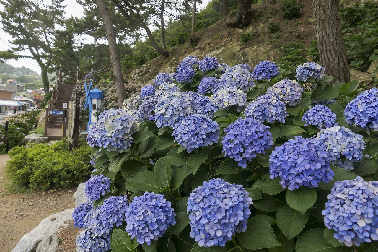 거제도 저구항은 섬의 남쪽 끝에 있어 섬을 세로로 가로지르며 줄곧 내려가야 한다. 철이 조금 지나긴 했지만 거제도 곳곳에는 보랏빛 수국이 탐스럽게 피어있다. 특히 저구항에는 수국 동산까지 마련되어 있다.