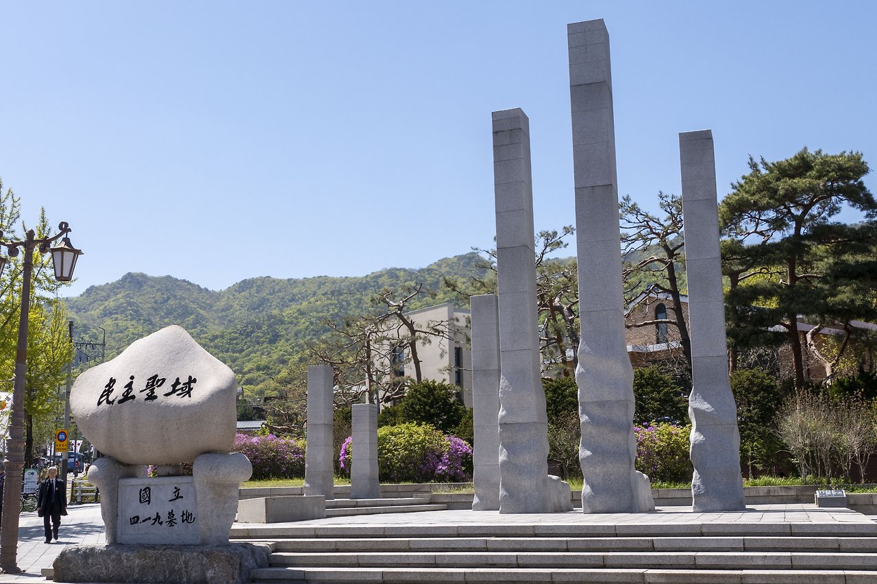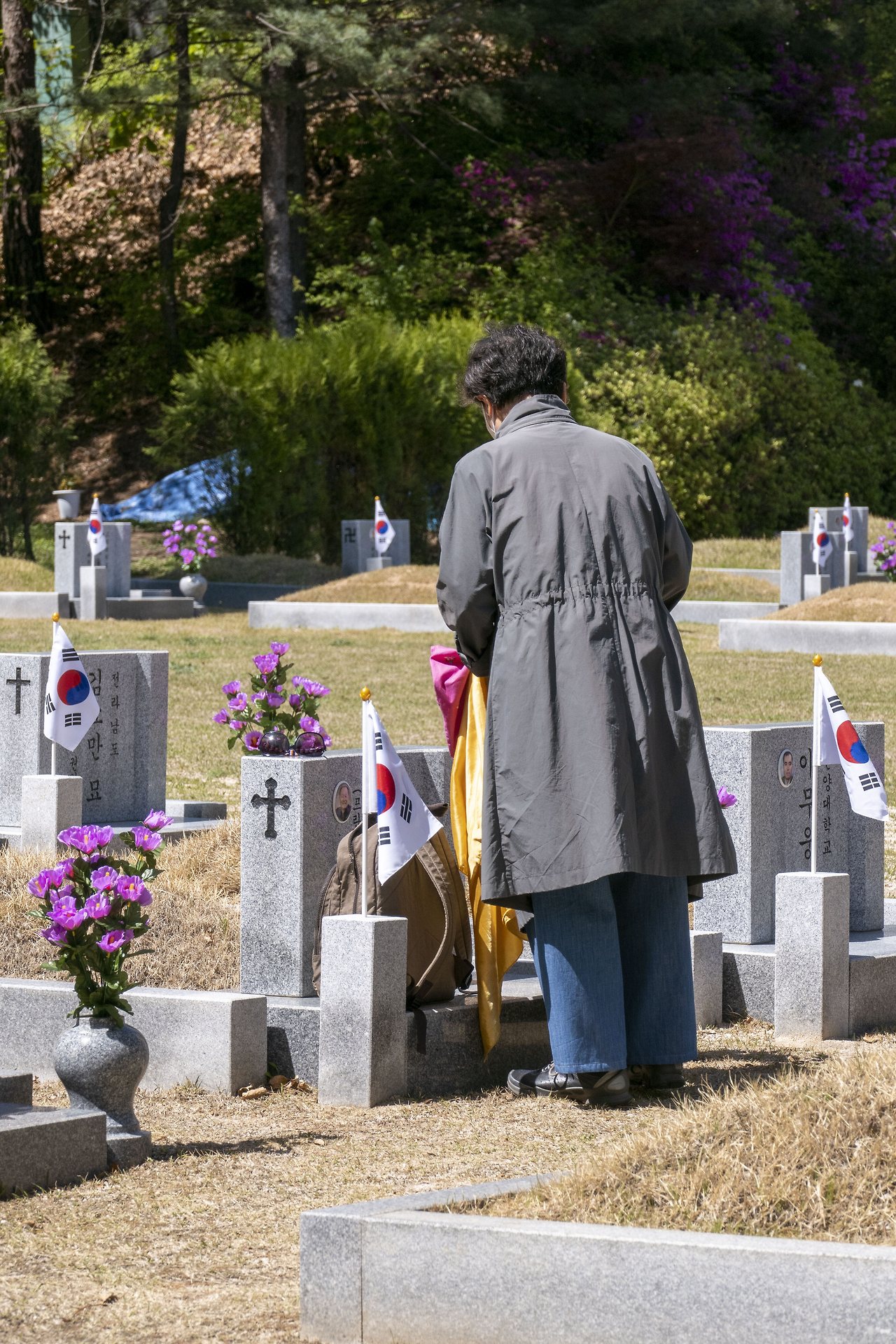 묘역 뒤쪽에 앉아 술을 마시며 망연자실하게 앉아 있는 이가 있다. 희생자와는 어떤 관계일까? 아마도 친구나 형제자매겠지? 누군가의 소중한 사람은 정의를 위해 그 아까운 나이에 세상을 등지고 말았다.