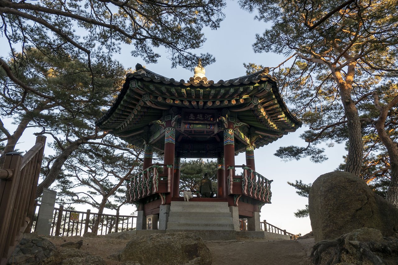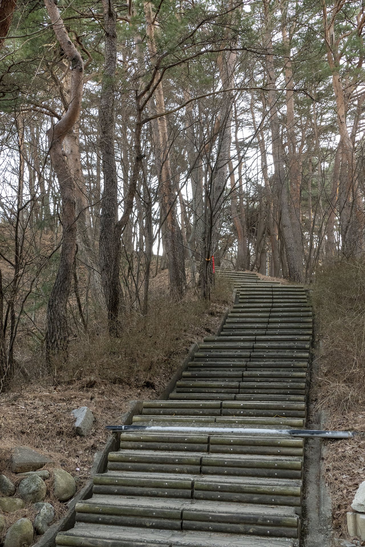 하늘을 찌를 듯 울창한 잣나무 군락지를 지나 정상에 오르도록 다른 등산객은 없었다. 따사로운 햇살과 맑은 공기 그리고 고요함 속에 발을 옮길 때마다 뽀드득거리는 발자국 소리만 들렸다. 혼자라면 무서웠을 수도 있지만 뒤에는 든든한 남편과 귀여운 강아지가 따라오고 있으니.