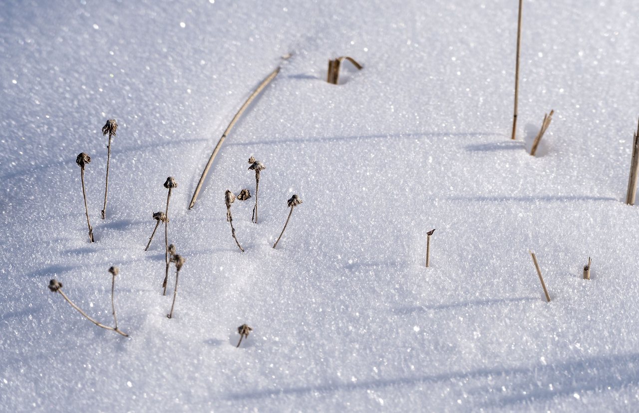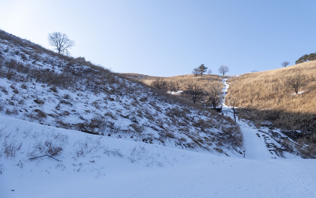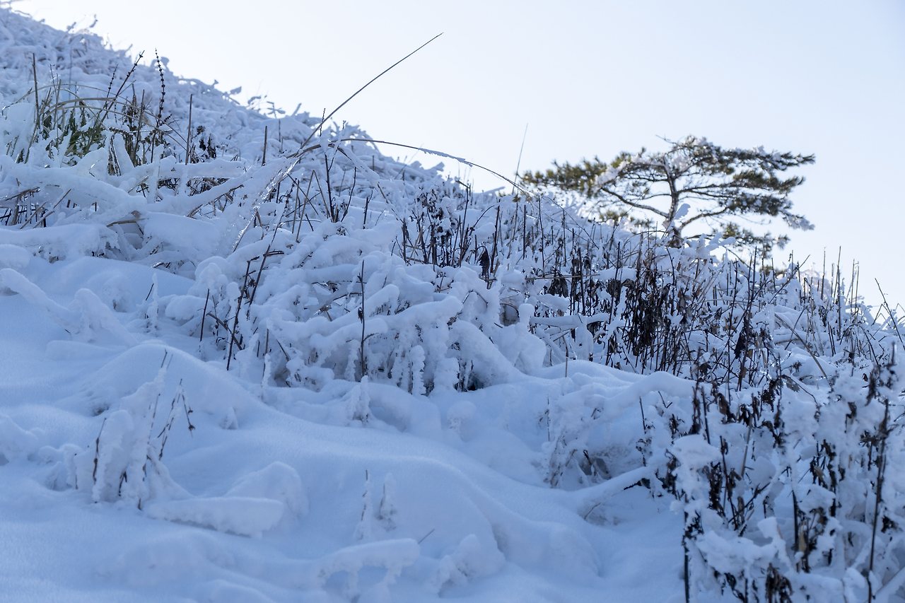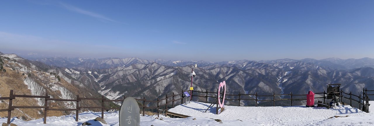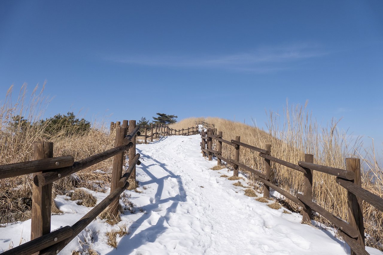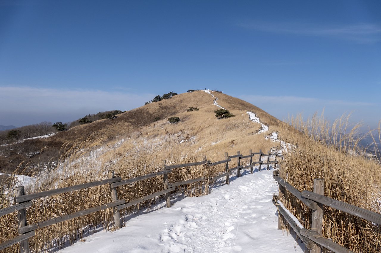 남편은 쓸데없이 멀리 돌아가는 완경사 길을 타박했지만, 미끄러운 언덕길을 힘들게 오르는 것보다 널찍한 길에서 설산의 장엄함도 맛보는 이 길이 얼마나 좋은가! 잠깐 오르면 지난가을 그리도 아름다웠을 억새밭과 정상 표지석이 있다. 생각했던 것보다는 억새의 양도 적고 눈도 다 녹아버려 다소 실망하긴 했지만 힘들지 않은 짧은 산행으로 이토록 멋진 풍경을 볼 수 있으니 얼마나 좋은가. 다음 가을에 찾아온다면 아마도 이 설경이 떠오를 게다. 민둥산이라더니 정말 주변에는 억새 외에는 나무가 거의 없다.