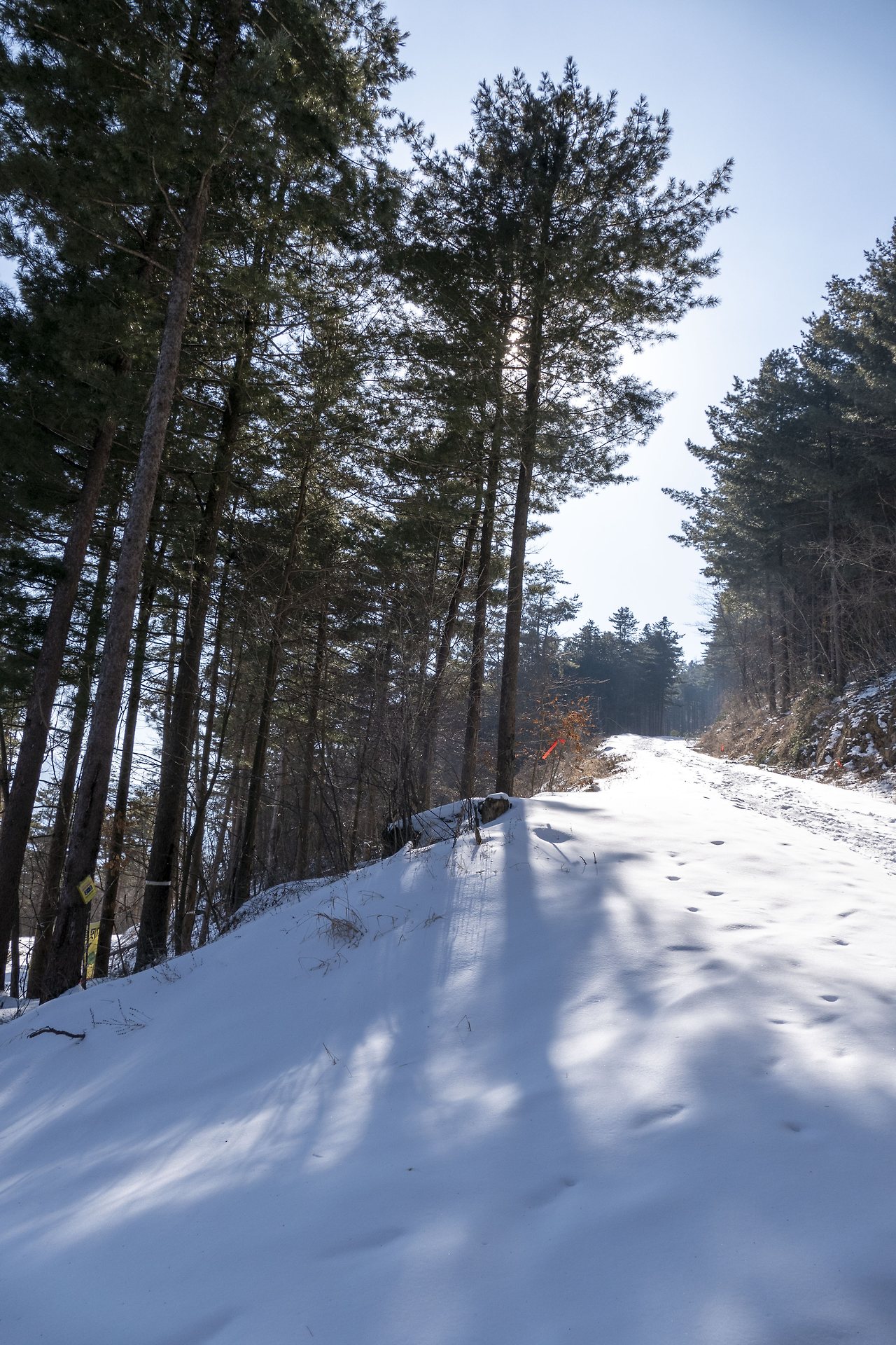 상상했던 것만큼 많은 눈은 없었지만 해가 들지 않는 곳에 남아있는 눈이라도 볼 수 있어 좋았다. 정상은 바로 눈앞. 임도인지 자동차도 지나갈 수 있을 만큼 넓은 길에는 지난 주말에 많은 사람들이 찾았는지 무수히 많은 발자국이 나있다. 어릴 때 비 오는 날 일부러 또랑으로 찰박거리며 걷던 생각이 나 아무도 밟지 않은 눈길로만 터벅터벅 걸었다.