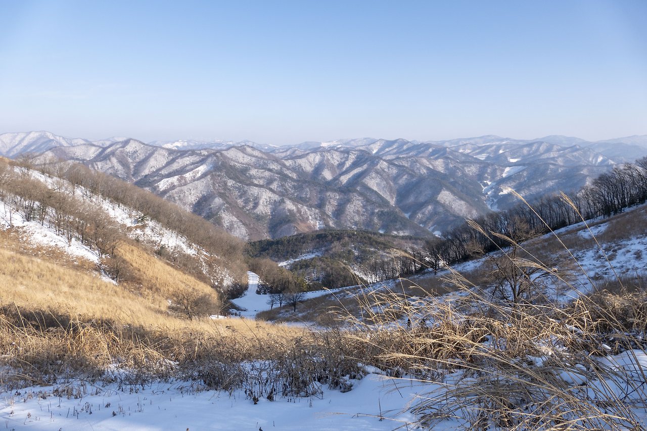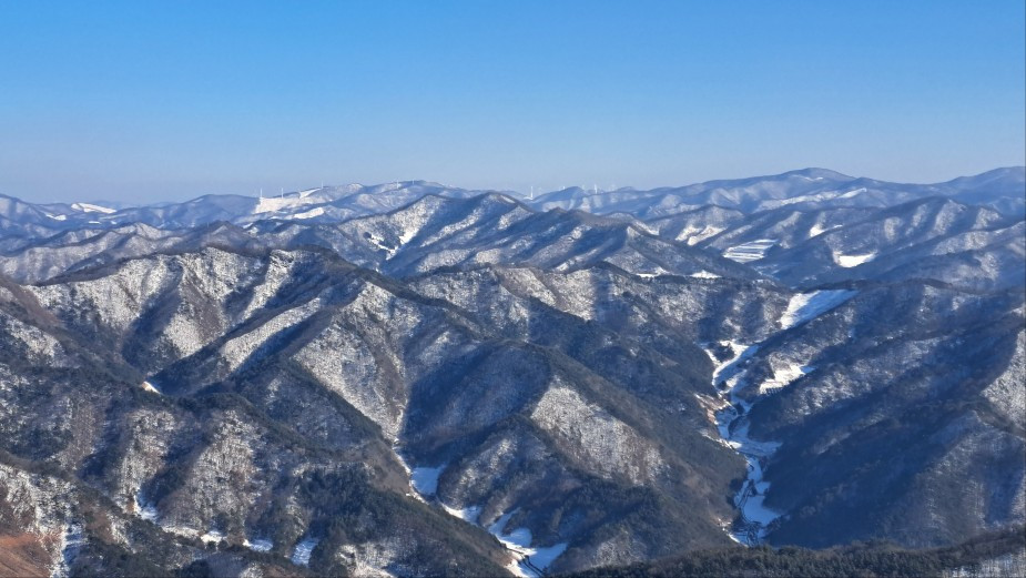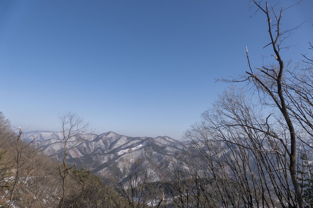 잣나무와 달리 잡목들은 낙엽을 다 떨구고 앙상한 가지만을 남긴 채 이 겨울을 보내느라 안간힘을 쓰고 있다. 눈이라도 소복하게 내려 감싸주면 좋으련만. 무심코 고개를 드니 건너편에 또 다른 산이 따라오고 있다. 힘차게 뻗은 산등성이 아래 눈이 쌓인 모습은 한 폭의 산수화였다. 와아~