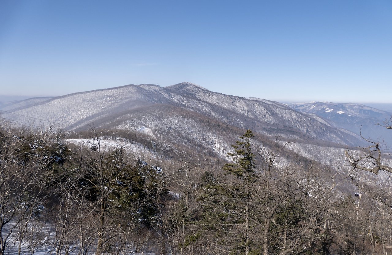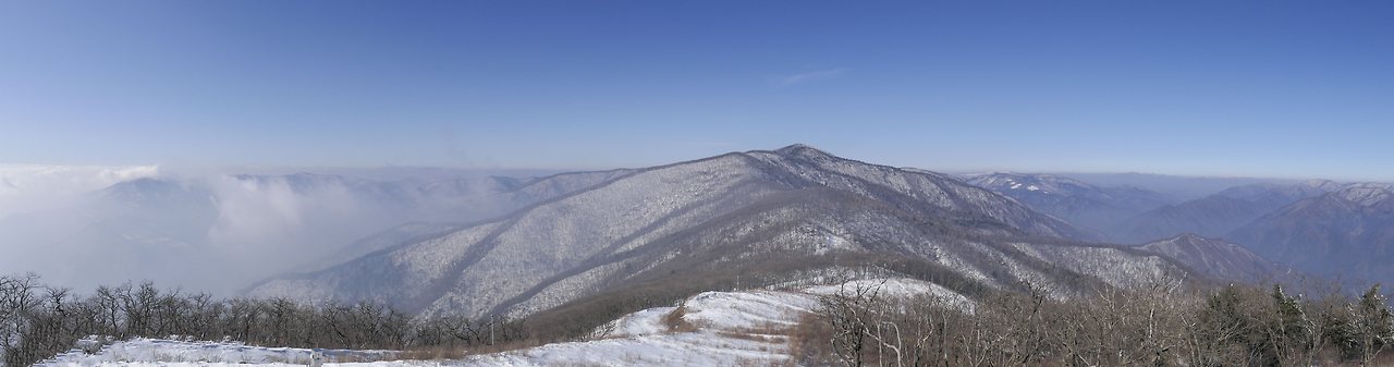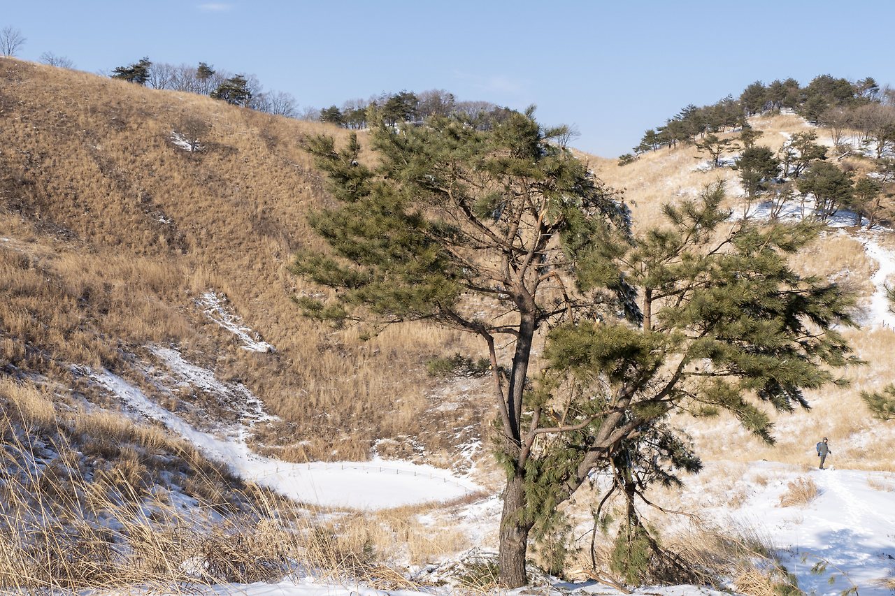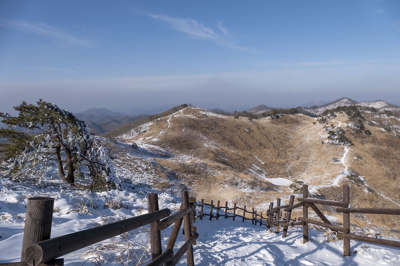 잣나무와 달리 잡목들은 낙엽을 다 떨구고 앙상한 가지만을 남긴 채 이 겨울을 보내느라 안간힘을 쓰고 있다. 눈이라도 소복하게 내려 감싸주면 좋으련만. 무심코 고개를 드니 건너편에 또 다른 산이 따라오고 있다. 힘차게 뻗은 산등성이 아래 눈이 쌓인 모습은 한 폭의 산수화였다. 와아~