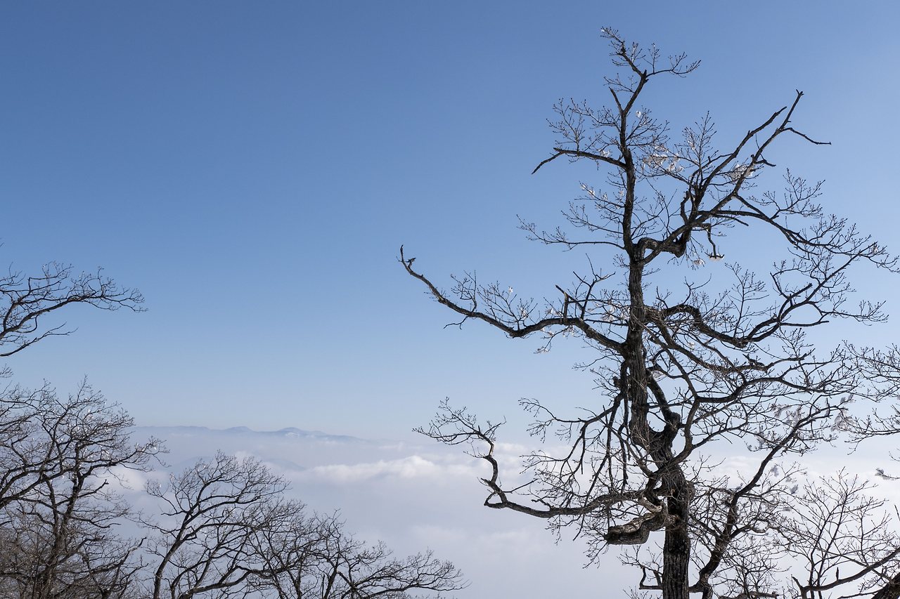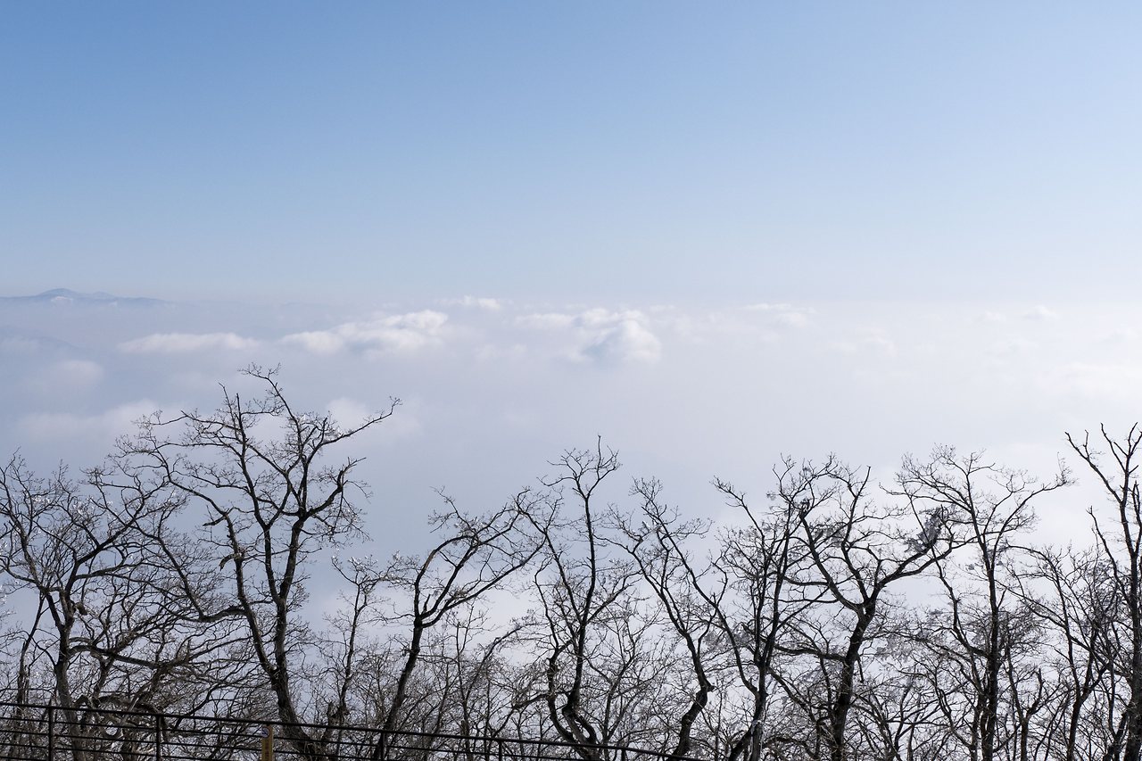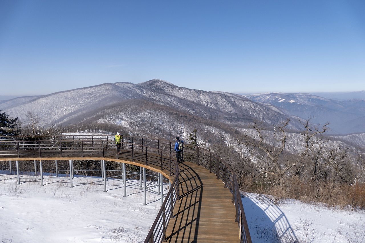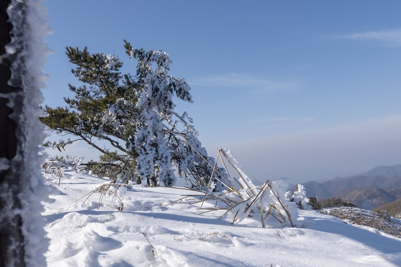 정상뷰야 말해 무엇하랴! 청명한 날씨 덕분에 주변 산들이 선명하게 보이고 나무 아래로 구름이 두둥실 떠다니고 있다. 한 가지 아쉬운 게 있다면 데크 아래로 산책길을 만들어 놓았으면 하는 바람이다. 상고대를 좀 더 가까이에서 보지 못해 아쉬웠다.