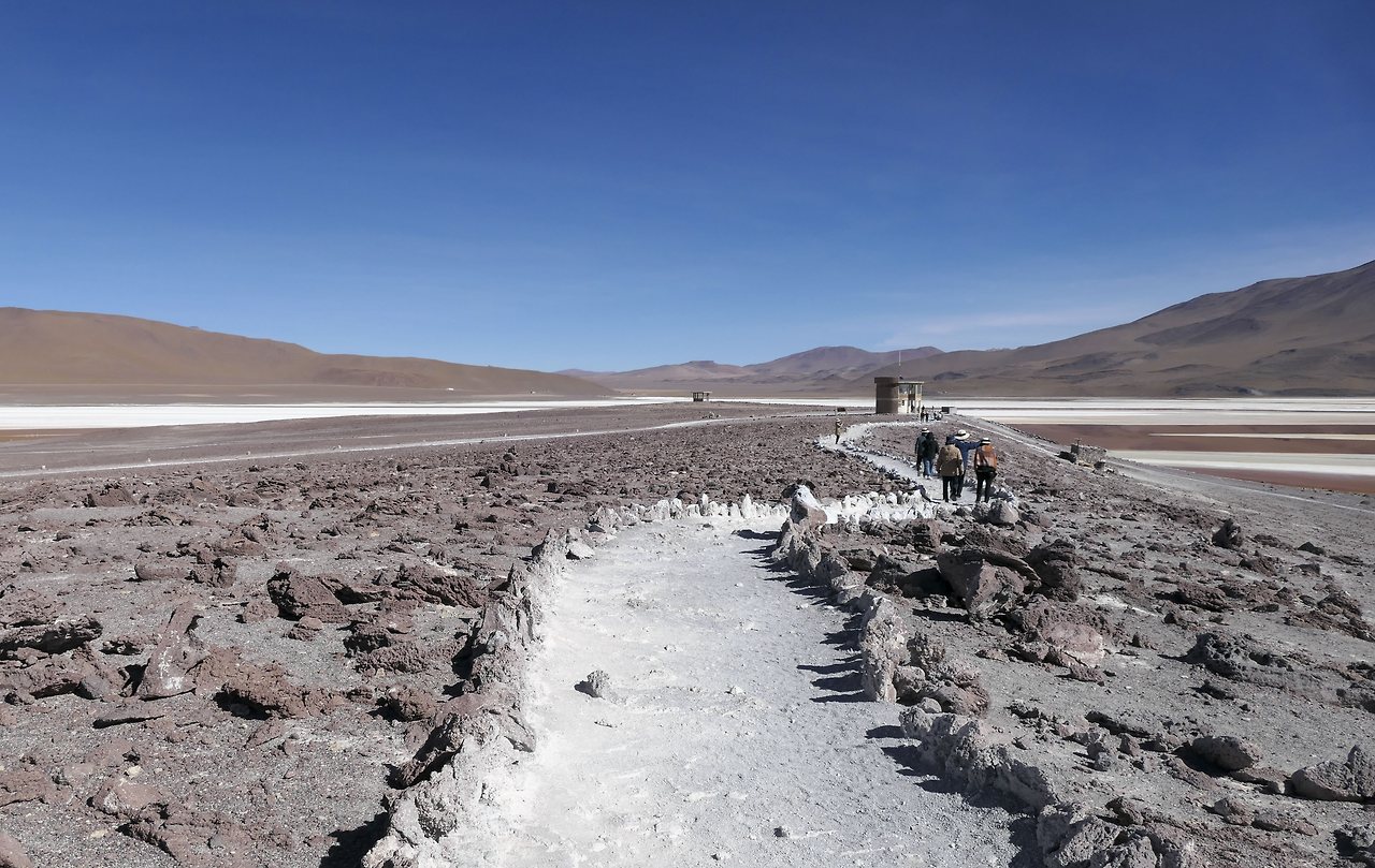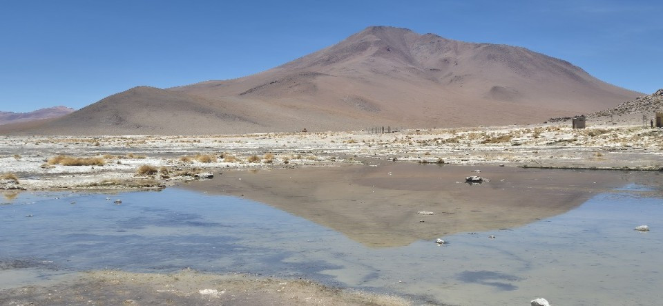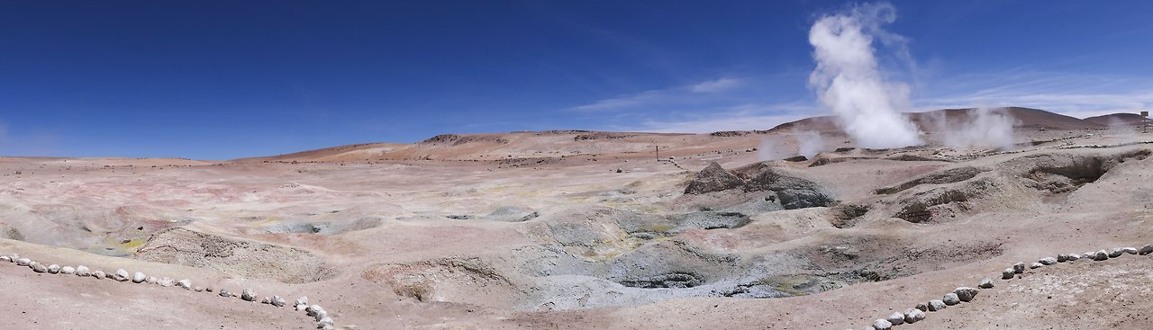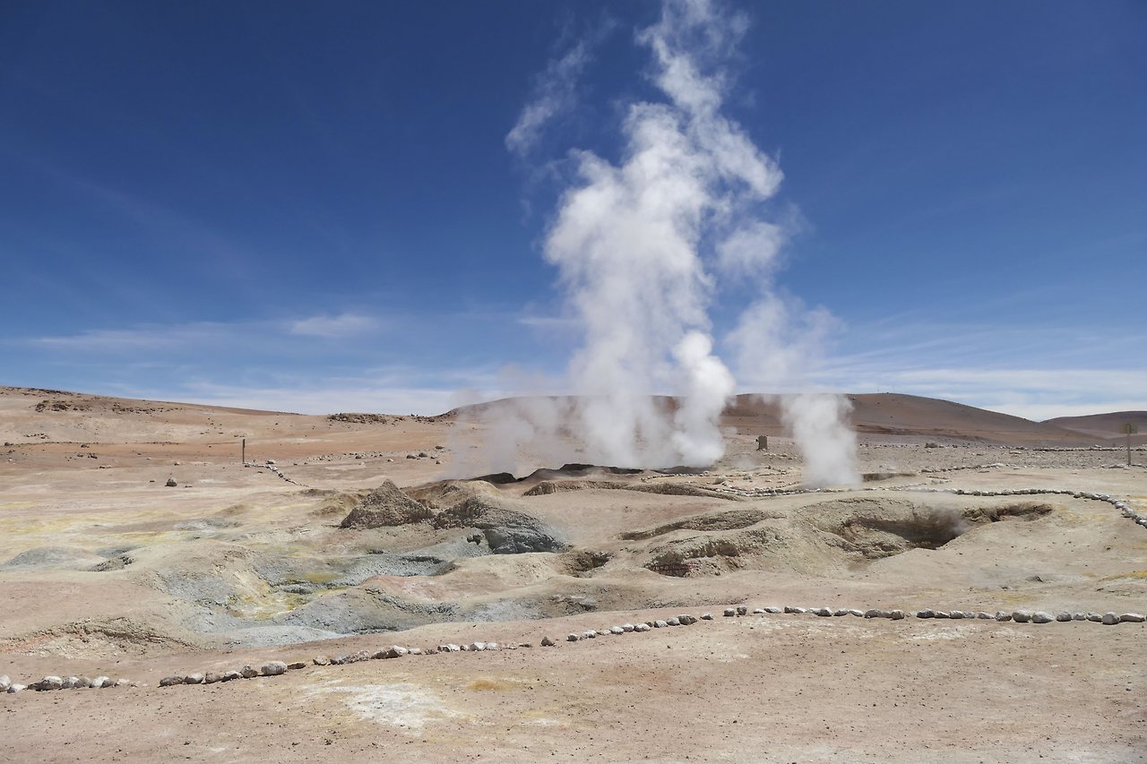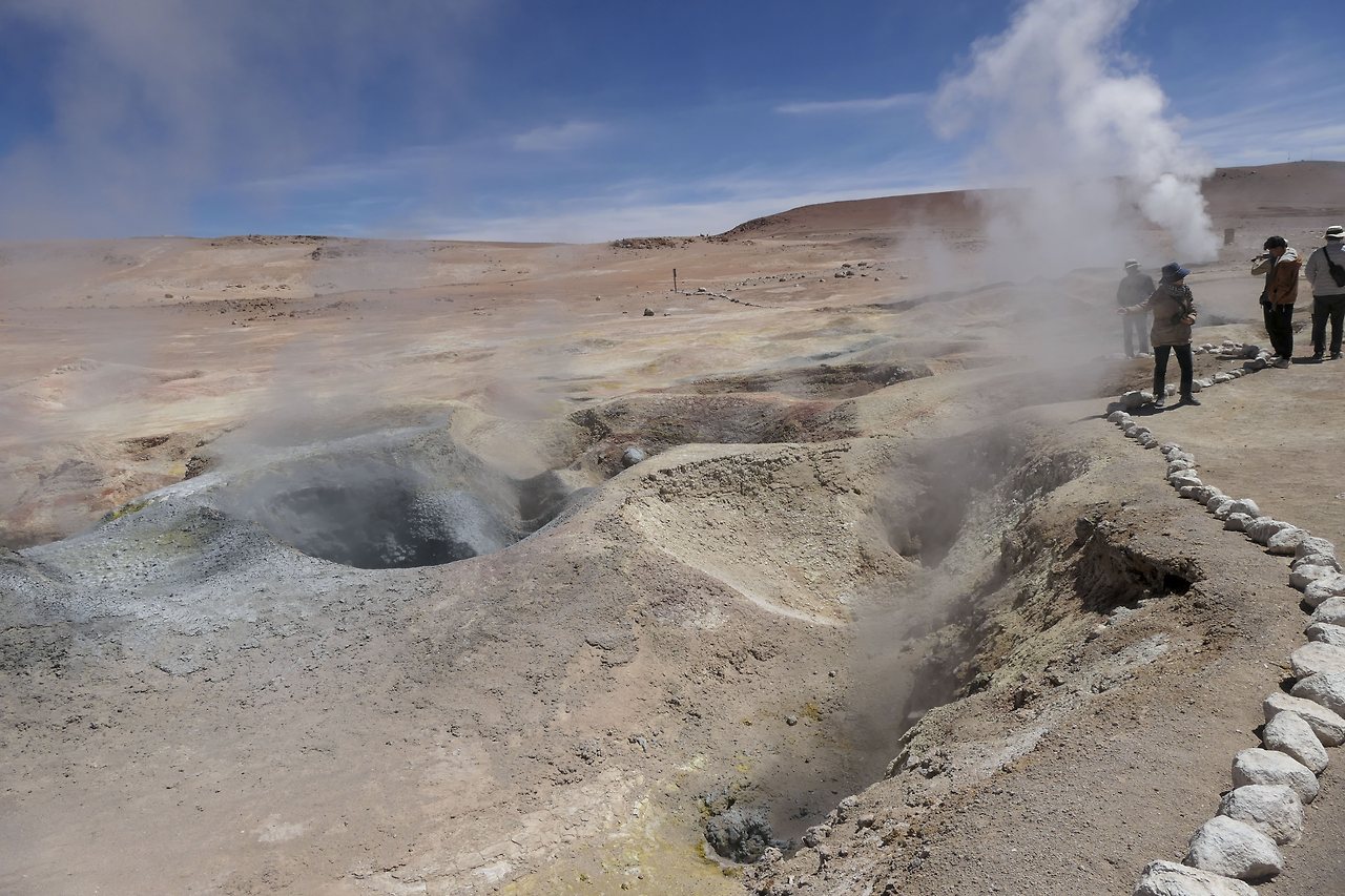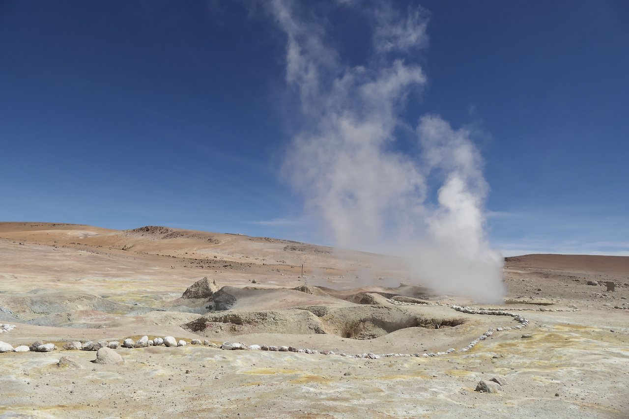 내일의 태양(Sol de Manana)이라는 곳에는 지금도 지열 활동으로 물이 끓고 있었다. 주변에 줄이 쳐 있는 것은 얼마 전 일본 관광객이 가까이 갔다가 죽었다고 한다. 간헐천의 증기가 많이 올라올 때는 최대 50 미터까지 솟아오른단다.