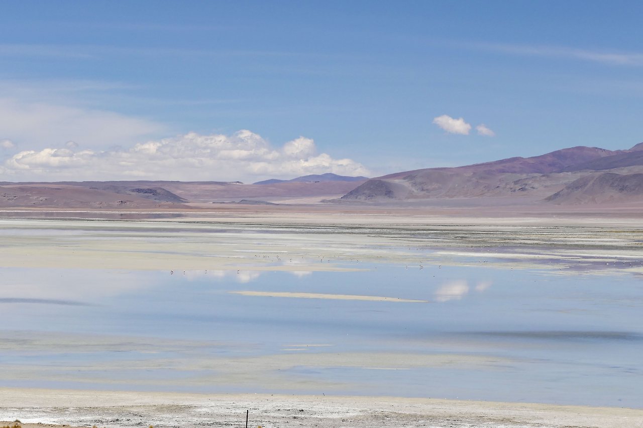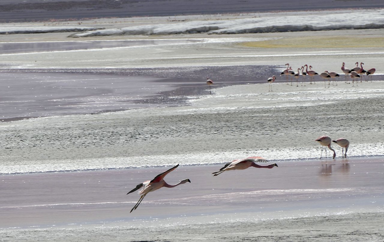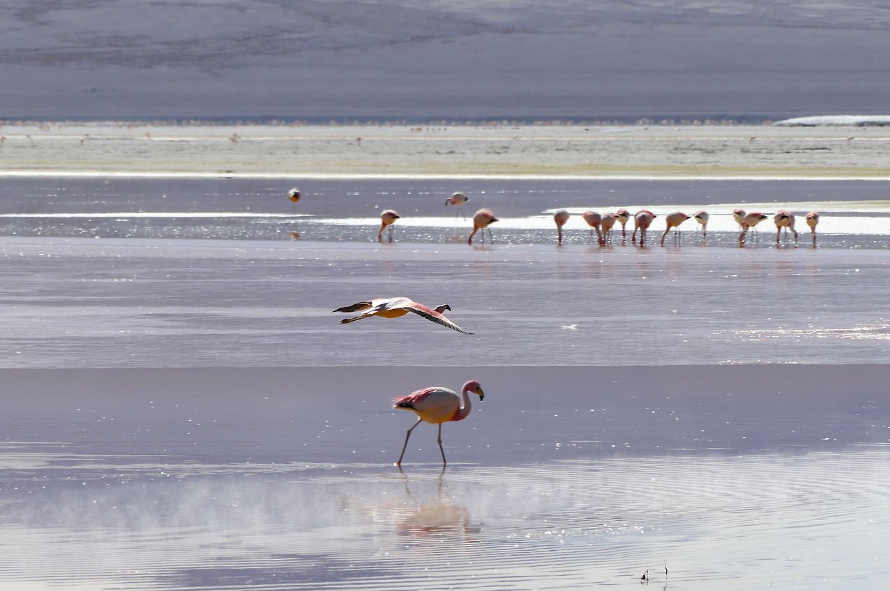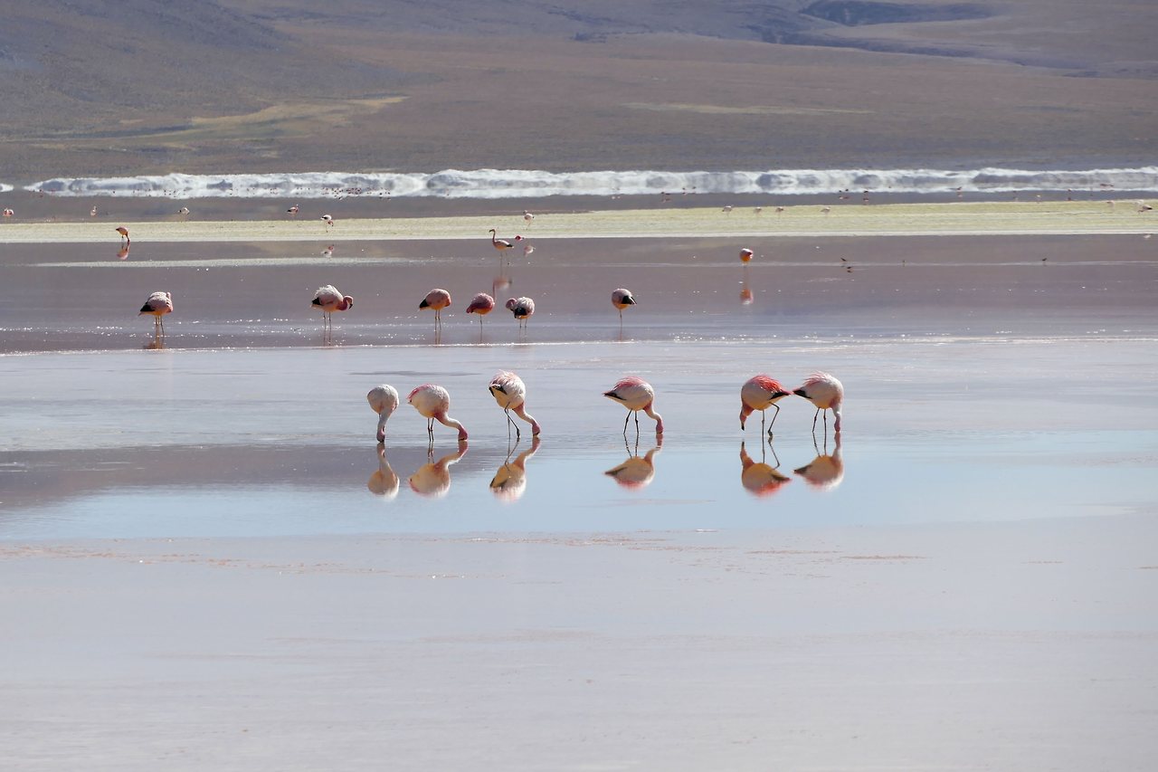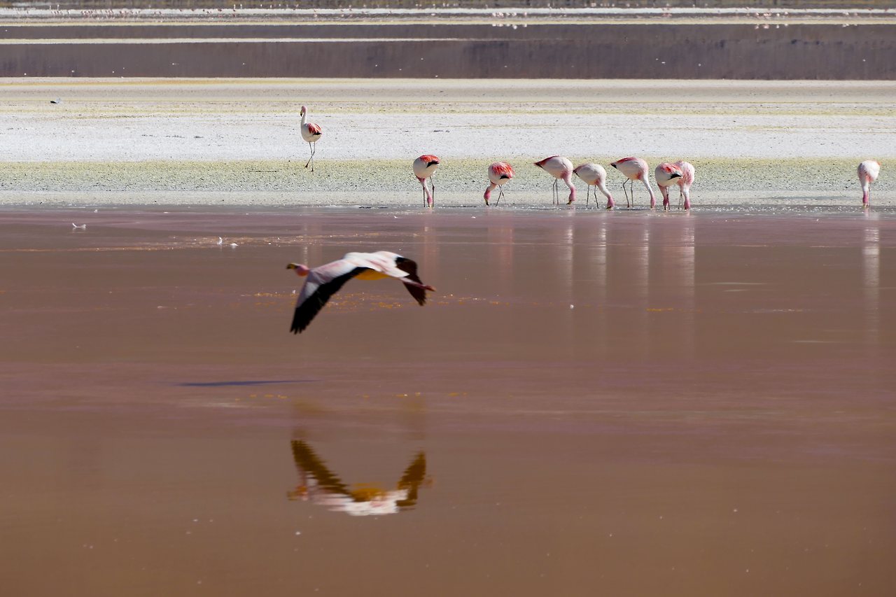 마치 천국에라도 가듯 홀린 듯 호수로 내려갔다. 열심히 먹이 활동을 하던 플라밍고는 놀라서 잠시 하늘을 날다가 좀 더 먼 곳에 자리를 잡는다. 우유니에서 하늘의 반영을 보지 못해 속상했는데 그보다 더 아름다운 플라밍고를 보았다. 이보다 더 아름다울 수 있을까?