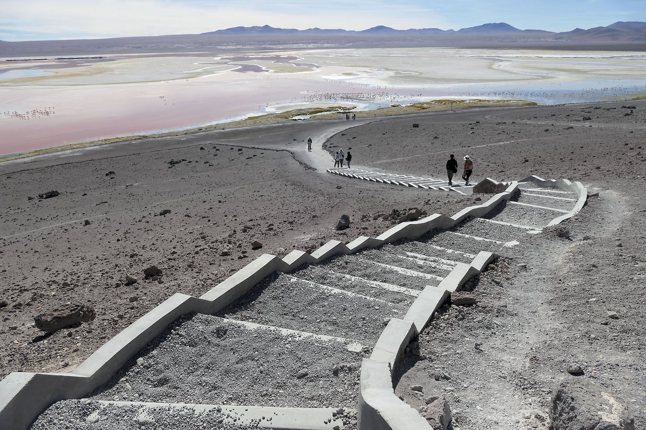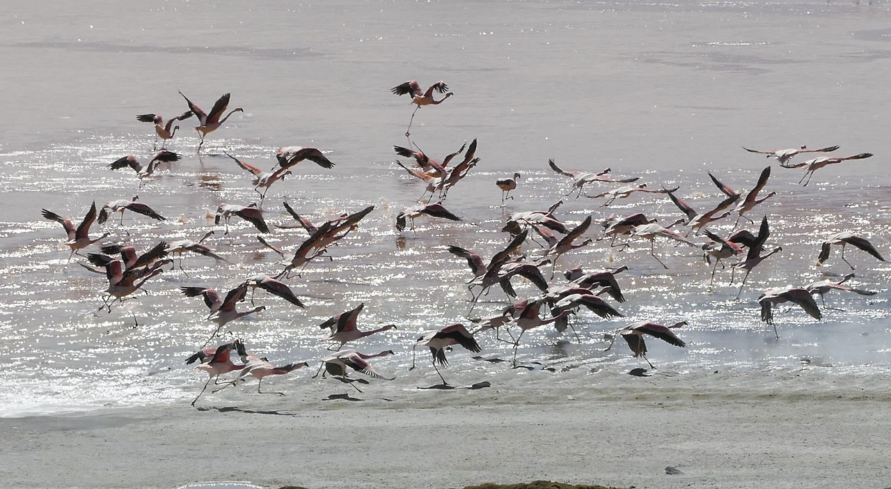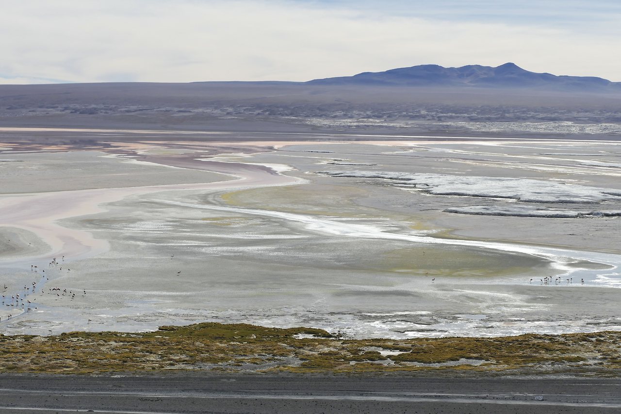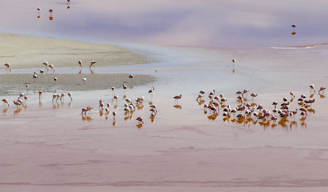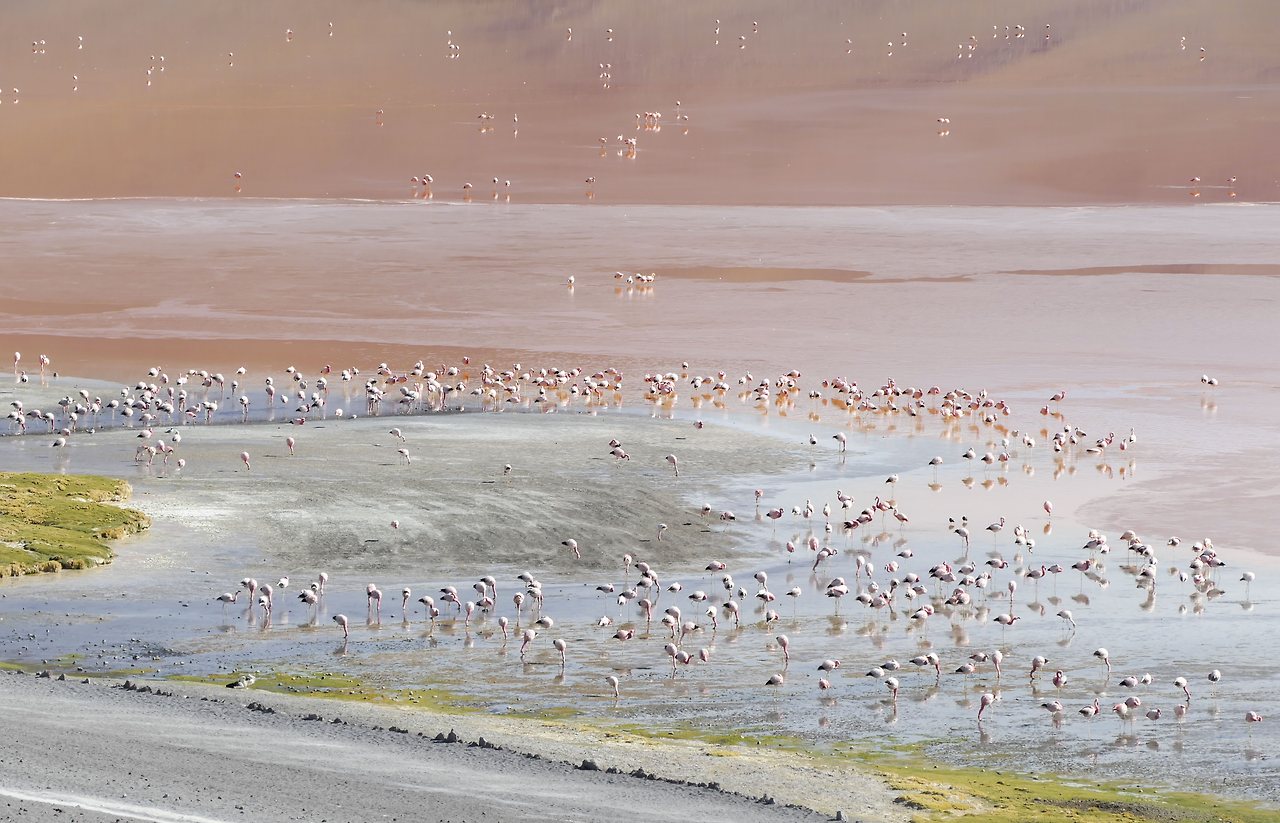 해발 4,000 미터가 넘는 곳에서 만난 화산과 호수의 풍경은 최고였다. 유능한 화가가 물감을 풀었다 해도 이만 못했을 것이다. 호수 속에 들어있는 미네랄 성분과 풍부한 플랑크톤은 다양한 색을 띠고있는데 그것을 먹고 자란 흰색과 회색의 플라밍고는 분홍색으로 변했다. 얼마나 많은 지 그 수를 헤아릴 수가 없다.