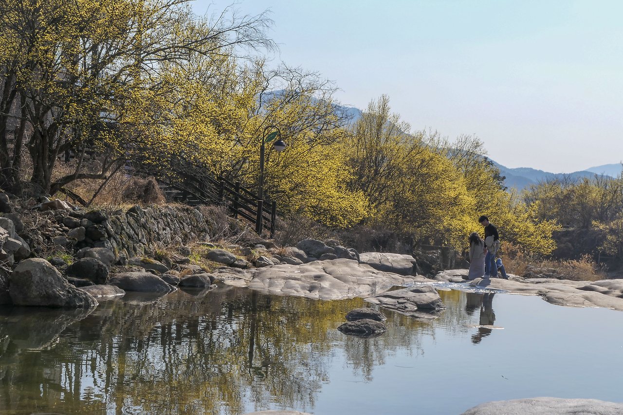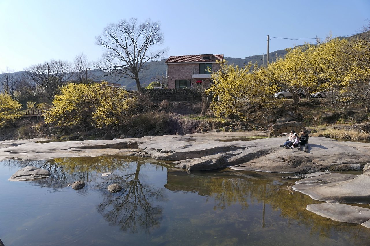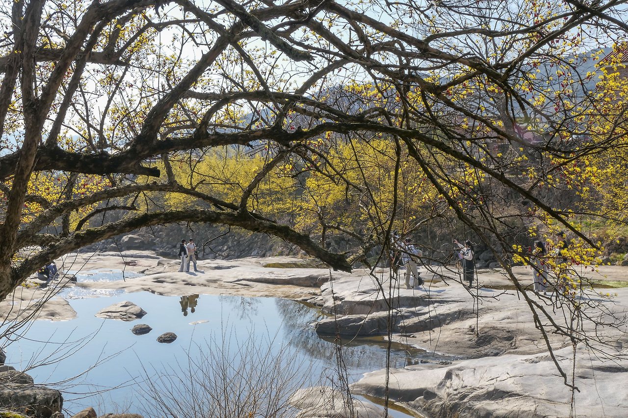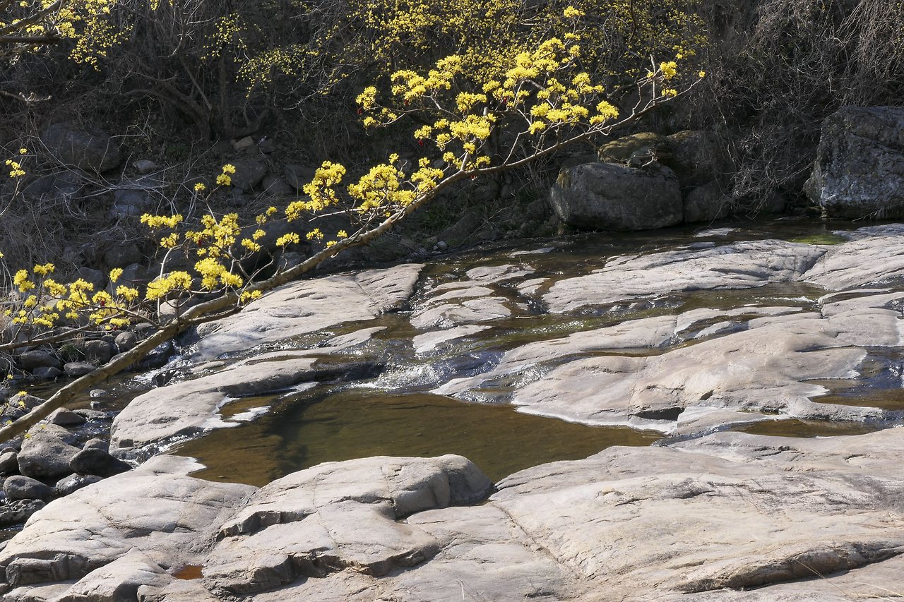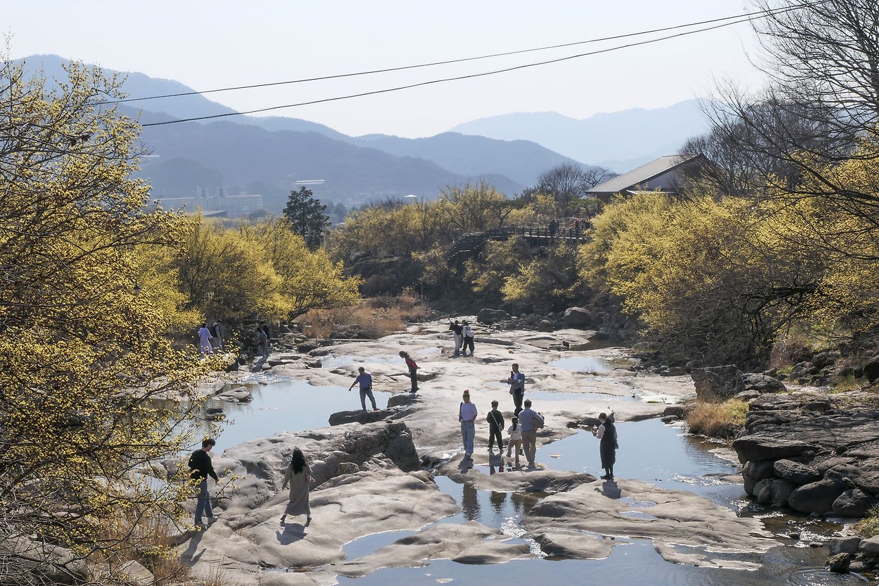 돌담사이에 핀 꽃이 햇살을 받으니 더 투명하다. 계곡으로 한껏 가지를 내려 빽빽하게 핀 꽃은 화려하기 그지없다. 사람들은 그 꽃 앞에서 더 예쁘게 보이려고 온갖 포즈를 취해보지만 봄꽃만 할까? 물빛도 노란 꽃도 그것을 즐기는 사람도 모두 봄을 만끽하고 있다.