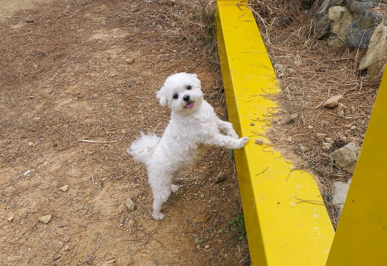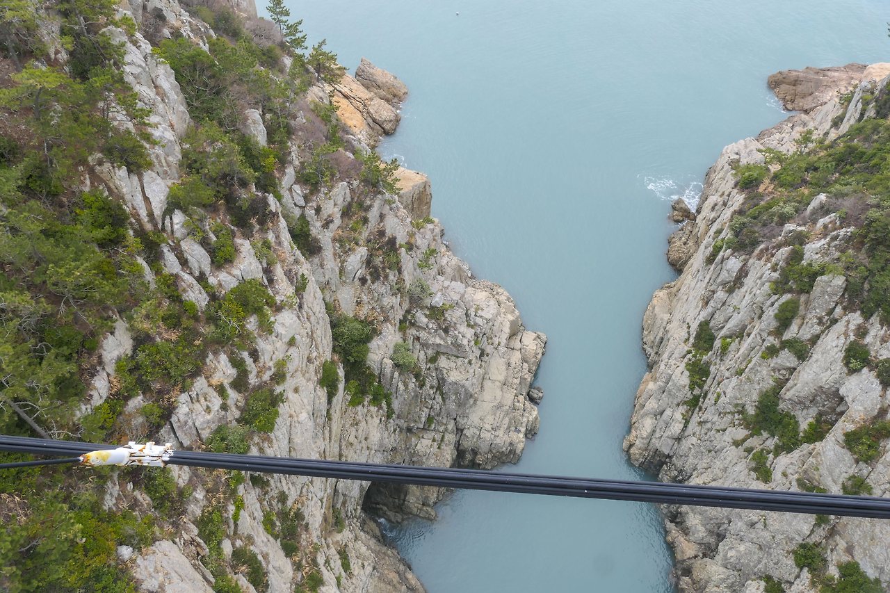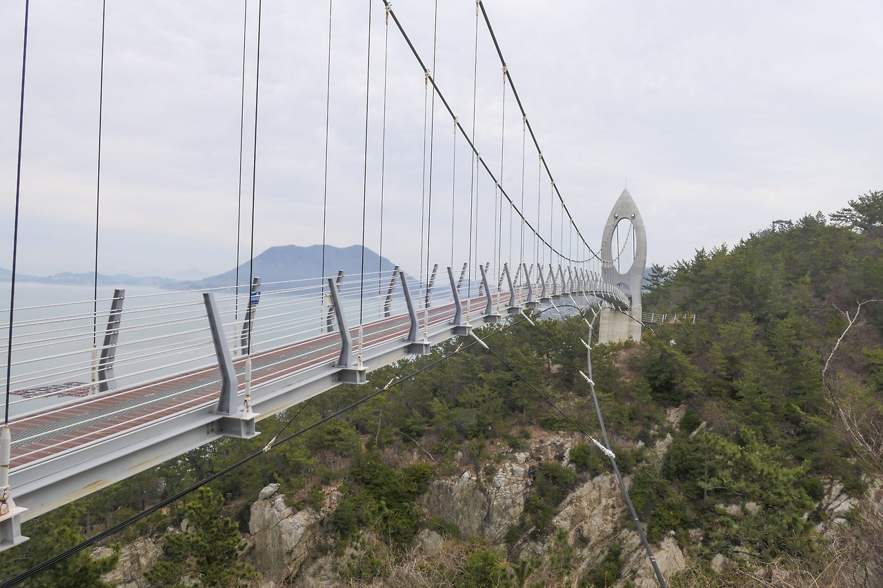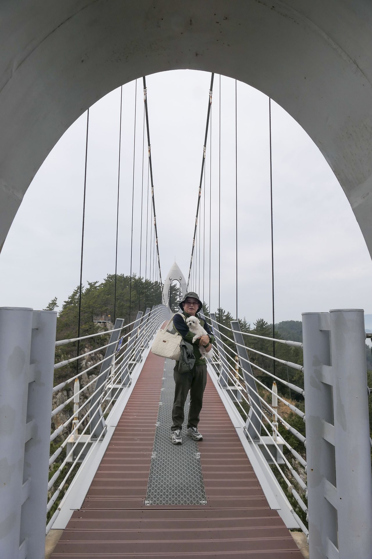 하화도에도 출렁다리가 있다. 꽃섬다리라고 하는데 손에 닿을 듯 가까운 곳에 있는 장구도와 연결했다. 절벽과 절벽을 연결한 다리는 길이가 약 100여 미터나 된다. 바람이 불면 실제로 움직인다고 하지만 고요한 날씨 덕분에 흔들리지는 않았다. 남편과 강아지를 다리의 타원 안에 담아 인증 숏 한 장!
