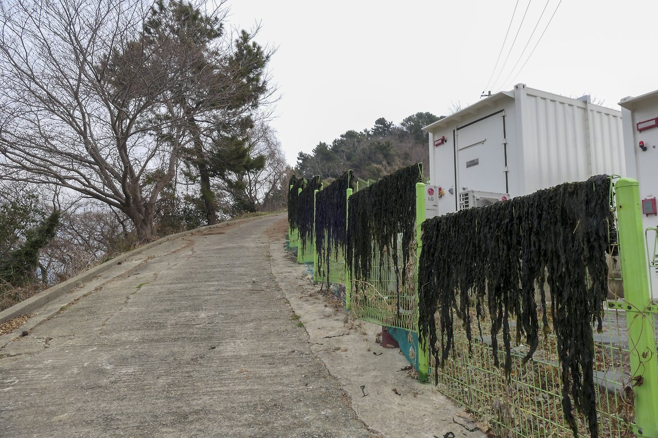 우리는 마치 여인네의 구두 형상을 하고 있는 섬의 발목 부분인 낭끝 전망대로 시작하여 반대편의 꽃섬다리로 향하는 코스를 택했다. 약간의 경사가 있지만 고작 100 미터도 안 된다. 바로 길 옆의 태양광 발전소 울타리 에는 바다내음 물씬 풍기는 미역이 주렁주렁 매달려 있다.