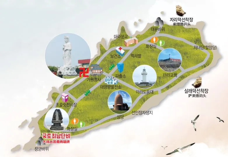 우리나라의 가장 동쪽에는 일본과 끊임없이 영토 마찰이 있는 독도가, 서북쪽에는 북한과 가장 가까운 군사 요충지인 백령도가, 그리고 남쪽에는 제주 모슬포항으로부터 11킬로미터 정도 떨어진 마라도가 있다. 짙푸른 바닷물이 넘실대는 가파른 절벽과 해식동굴이 절경을 이루고 있는 마라도는 워낙 작아서 천천히 걸어도 2시간이면 된다.
