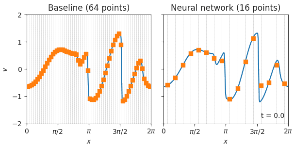 [그림4] 상세 설명 - 유체의 충격파 모델인 버거스 방정식(Buerger's equition) 시뮬레이션은 표준 유한 체적법(왼쪽) 또는 신경망 기반 방법(오른쪽)으로 해결되었습니다. 주황색 사각형은 저해상도 그리드에서 각 방법의 시뮬레이션을 나타냅니다. 이 포인트는 각 시간 단계에서 모델로 피드백되어 변경 방법을 예측합니다. 파란색 선은 훈련에 사용된 정확한 시뮬레이션을 보여줍니다. 신경망 솔루션은 파란색 선을 부드럽게 추적하는 주황색 사각형으로 표시된 것처럼 4배 더 거친 그리드에서도 훨씬 좋습니다.