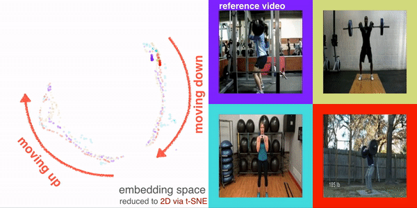 [그림 18] 상세 설명 - 오른쪽: 스쿼트 운동을 하는 사람들의 비디오를 입력하십시오. 왼쪽 상단의 비디오가 참조하세요. 다른 비디오는 스쿼트를 하는 사람들의 다른 비디오에서 가장 가까운 주변 프레임(TCC embedding space)을 보여줍니다. 왼쪽: 동작이 수행 되었기 때문에 해당 frame embedding이 이동합니다.