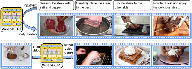 [그림 19] 상세 설명 - 쿠킹 비디오에 대해 사전 교육을 받은 VideoBERT의 질적 결과. 위: 몇 가지 레시피 텍스트가 주어지면 일련의 시각적 토큰을 생성합니다. 아래: 시각적 토큰이 주어지면 VideoBERT가 예측한 상위 3 개의 미래 토큰을 다른 시간 단위로 표시합니다. 이 경우 모델은 밀가루와 코코아 가루 한 그릇이 오븐에서 구워지고 브라우니나 컵케익이 될 수 있다고 예측합니다. 피처 공간에서 토큰에 가장 가까운 트레이닝셋의 이미지를 사용하여 시각적 토큰을 시각화합니다.