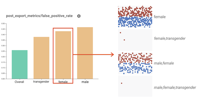 [그림1] 상세 설명 - 공정성 지표에서 슬라이스를 클릭하면 What-If Tool 위젯 내에서 해당 슬라이스의 모든 데이터 포인트가 로드됩니다. 이 경우 "여성"레이블이 있는 모든 데이터 요소가 표시됩니다.