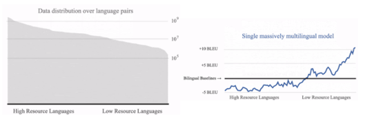 Exploring Massively Multilingual, Massive Neural Machine Translation에서, 100개의 개별 모델이 아닌 단일 모델을 100개 언어로 번역하도록 훈련함으로써 번역 품질이 크게 향상 되었습니다.