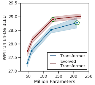 [그림 14] 상세 설명 - 다양한 크기의 WMT'14 En-De에서 Evolved Transformer와 원본 Transformer의 비교 더 큰 크기의 성능에서 가장 큰 성능 향상이 발생하는 반면, ET는 더 큰 크기의 강도를 보여 주므로 37.6% 더 적은 매개 변수로 가장 큰 Transformer를 능가합니다 (비교 모델은 녹색 원으로 표시). 정확한 숫자들은 논문에 수록된 표3을 참조하십시오.
