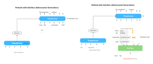 [그림 17] 상세 설명 - 왼쪽: Transformer 모델이 입력 문장(왼쪽 아래)에 적용되고 target output sentence(오른쪽 위) 및 input sentence(중간 오른쪽: "<sos>" placeholder로 시작)과 함께 translation loss가 계산됩니다. AdvGen 함수는 소스 문장, 단어 선택 분포, 단어 후보 및 번역 손실을 입력으로 사용하여 adversarial source example를 구성합니다. 오른쪽: 방어 단계에서 adversarial source example는 Transformer 모델에 대한 입력으로 사용되며 변환 손실이 계산됩니다. 그런 다음 AdvGen은 위와 동일한 방법을 사용하여 대상 입력에서 adversarial target example를 생성합니다.
