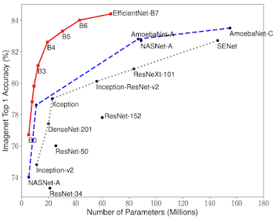 EfficientNet : AutoML 및 Model Scaling을 통한 정확도 및 효율성 개선에서 신경 아키텍처 검색 기술을 사용하여 컴퓨터 비전 문제에 대해 84.4 % 의 최고 정확도의 새로운 최신 결과를 포함하여 실질적으로 더 나은 결과를 얻는 방법을 보여주었습니다. ImageNet에서 이전 최고 모델보다 8 배 적은 매개 변수를 갖습니다.