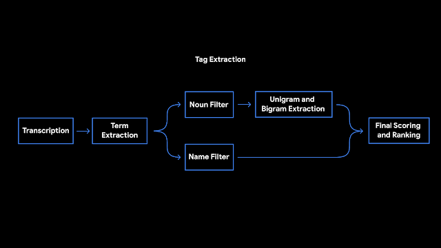 녹음이 종료될 때 이러한 태그를 즉시 제안할 수 있도록, Recorder는 녹음 내용을 번역하면서 내용을 분석합니다. 먼저 Recorder는 문장에서 용어 출현들과 문법적인 역할을 계산합니다. 엔터티로 식별된 용어들은 대문자로 표시됩니다. 그런 다음, 우리는 문법 역할에 따라 문장의 각 단어에 레이블을 붙인 모델인 on-device part-of-speech-tagger를 사용자들에 의해 더 기억하기 쉽게 보이는 일반 명사들과 적절한 명사들을 감지하여 이용합니다. Recorder는 유니그램(unigram) 및 빅그램(bigram) 용어 추출 모두 지원하는 이전 스코어 테이블을 사용합니다. 점수들을 생성하기 위해 우리는 대화형 데이터를 사용하여 boosted decision tree알고리즘으로 훈련시키고 문서들의 단어 빈도 및 특이성과 같은 텍스트 기능을 활용했습니다. 마지막으로 중지 단어 및 욕설 필터링이 적용되고 상단 태그들이 출력됩니다.