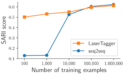 데이터 효율성: LaserTagger는 수백 또는 수천 건의 훈련 예제만 사용하여 훈련하더라도 합리적인 출력을 생성합니다. 우리의 실험들에서, competitive seq2seq baseline은 비슷한 성능을 얻기 위해 수만 개의 예제들이 필요했습니다.