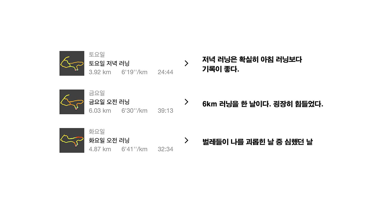 지금 내 단계에서는 무엇을 중요하게 생각해야 하는가. 그게 내 마음을 복잡하게 만들곤 한다. 올바른 자세와 호흡으로 뛰는 걸 가장 중요하게 생각하려고 하지만 정작 뛰게 되면 조금이라도 시간을 단축시키려고 하는 마음이 더욱 커진다. 나는 아직 많이 부족하고 어설프다.