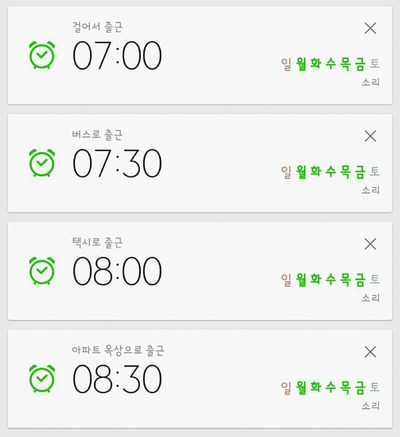 제가 작년에 설정했던 알람들입니다. 7:30분에 일어나게 되면 계획했던 아침운동 스케쥴은 물거품이 됩니다. 부지런한 사람들, 건강한 사람들은 아침에 살짝 땀이 날 정도로 러닝을 한다고 하더라고요. 그래서 저, 헬스도 등록했었습니다.