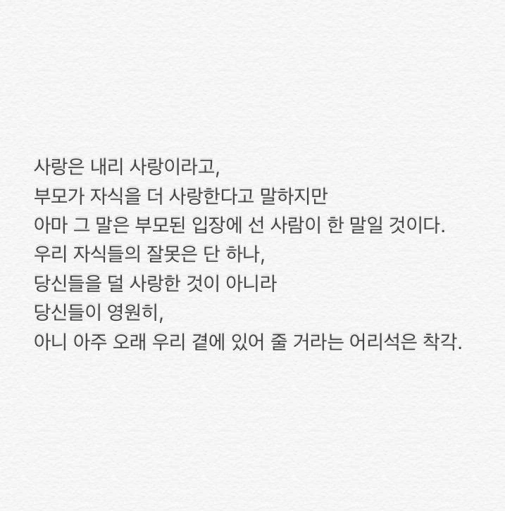그 사이에 나는 디어마이프렌즈를 다시 보며 이 대사가 가슴에 와서 박히는 것을 느꼈고, 현실도피하려 파고든 인터넷 세상에서 이런 글을 접하고는 다시 한번 가슴이 찢어지는 것 같았다. 이후 시간이 지나고 나는 동생과 따로 나와 살게 됐고, 우리는 적당한 거리가 생기면서 관계를 회복해갔다. 음식 레시피 물어보기를 빙자한 안부전화라도 하게 되고, 동생과 어떻게 사는지 궁금한 엄마도 전화를 더 자주 걸면서 평소에는 안 했던 이야기들을 더 하게 됐다. 그러면서 생각했다. 부모 자식 간에도 적당한 거리가 필요하다는 것. 한평생 물가에 내놓은 아이라고만 생각하지 말고, 천년만년 내가 의지할 수 있는 대상이라고 생각하지 말고. 성인이 된 이후부터는 각자를 사람 대 사람으로 존중해야 한다는 생각.