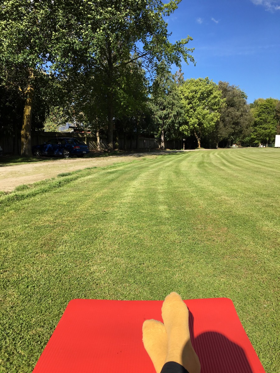 천천히 이동하자는 생각에서 근방의 저렴한 캠프 사이트에서 하루를 묵었는데, 근심 걱정이 없어지니 이렇게 행복할 수가.. 햇빛 내리쬐는 잔디밭에 요가매트를 펴 놓고 운동 후 샤워하고 나오니 세상 천국. 해가 길어지면서 거진 아홉 시까지 밖이 훤하니, 한참 책 읽고 글 쓰고 요리한다고 뚝딱거려도 밝아서 좋다.