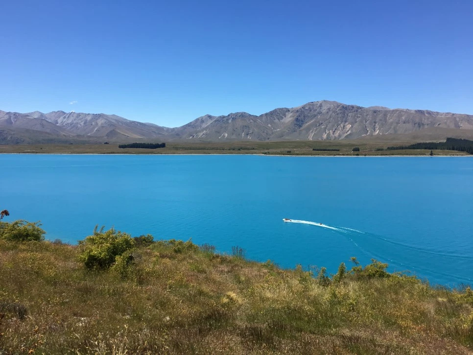 역시나 위에서 본 테카포 호수는 장관이었다. 지난 2월부터 남섬에 오면 꼭 와야지 와야지 했던 곳이 여기였다. 오클랜드에서 잠시 지냈던 단기플랫에서 만난 커플이 남섬에 내려가면 테카포/푸카키를 꼭! 무조건! 반드시! 가야 한다고 강조했기 때문이었다. 호수가 뭐 호수지, 퀸스타운의 와카티푸에도 굉장히 만족했었기에 엄청난 기대를 하진 않았지만 계속 궁금했다. 이제는 절실히 알겠다. 남섬에 여행 간다는 사람이 있으면 나는 무조건 여기를 가라고 추천할 것이다. 뉴질랜드에 산 지 1년이 다 되어도 여전히 호수 위를 달리는 제트스키는 비현실적이다. 물 색 때문인지 DI 잘 된 영화나 애니메이션을 보고 있는 것 같은 착각도 들고.