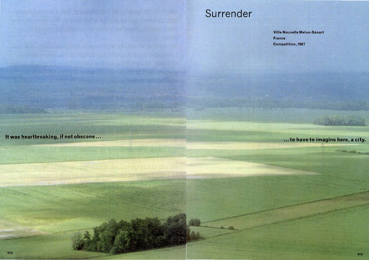 라카통바살의 광장 설계로부터 10년 전, 1987년에 파리 근교의 신도시를 계획하는 공모전에 참가하는 렘 콜하스의 마음도 아마 이러한 이유로 복잡했을 것이다. 믈렁 Melun 과 세나르 Senart라는 파리 남쪽에 위치한 지역의 인구는 점점 늘어나고 있었고 이를 그대로 둔다면 아마 마구잡이로 개발되어 금세 특성 없는 그렇고 그런 근교가 되어버릴 터였다. 그러니 신도시를 짓기 위한 마스터 플랜의 목표는 동네가 무분별하게 도시화하며 성장하는 것을 막고 필요한 기반 시설과 고유한 정체성을 갖춘 새로운 도시를 계획하는 것이었다. 하지만 현장에 도착해 평화로운 농촌 마을과 아름다운 숲을 마주한 렘 콜하스는 무척이나 곤혹스러웠다. 이유야 어쨌든 어떤 식의 개발도 이곳에 펼쳐진 아름다운 풍경을 해칠 터였다. 후에 이 프로젝트를 설명하기 위해 쓴 <항복> Surrender라는 글은 푸르른 대지를 담은 항공사진과 함께 이런 문장으로 시작한다.