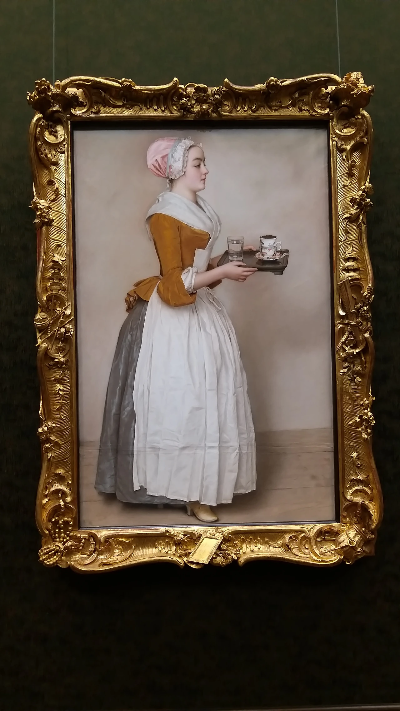 코코아 잔과 물컵이 올려진 쟁반을 들고 가는 그녀의 얼굴은 코코아 보다 더 달콤하고 부드러운 색감으로 빛난다. 파스텔화의 최고작인 듯 내게 깊은 인상을 주었다.