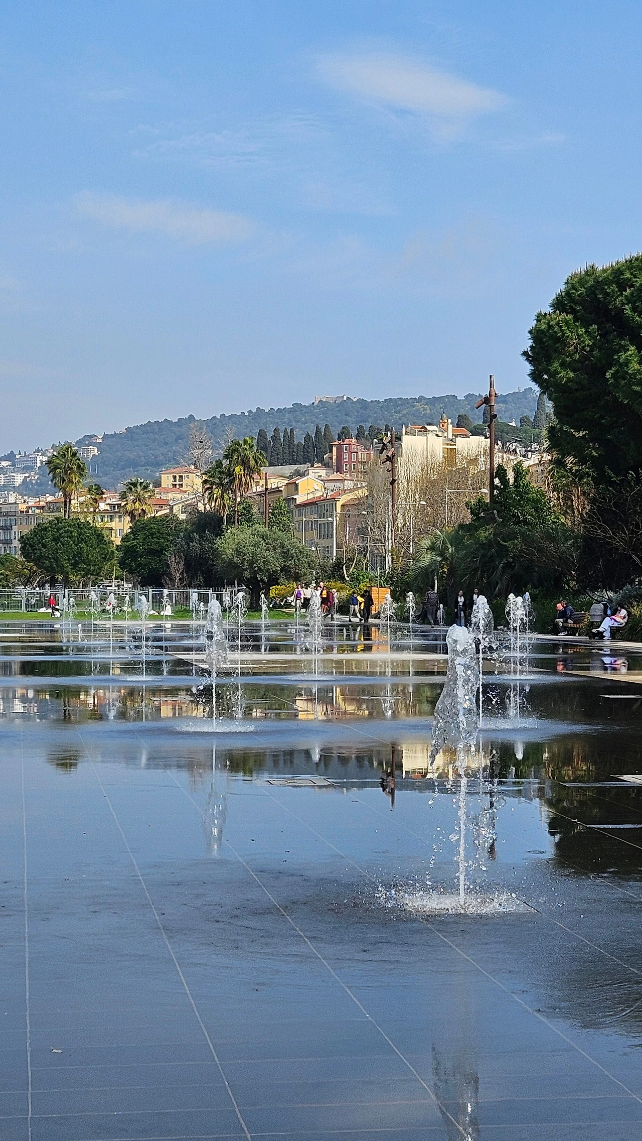 열대의 키 큰 나무형상을 한 조형물과 바닥에서 뿜어진 작은 물길이 거울이 되어 니스의 언덕을 비춘다.