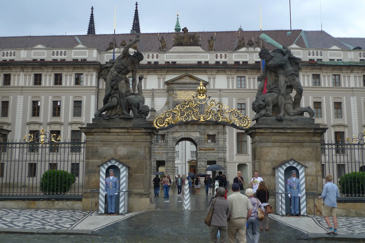 옅은 회색 제복을 입고 무뚝뚝한 표정을 지은채 정문을 지키는 경비대 2명이 보이기 시작했다. 프라하성 입구에 도착했다는 뜻이다. 대통령 관저가 프라하성 내부에 있었기에 경비대들이 관광객들을 맞이하고 있었던 것. 프라하성 영역에 발을 들이자, 다시 한번 비가 멈췄다. 정말 다행이었다.