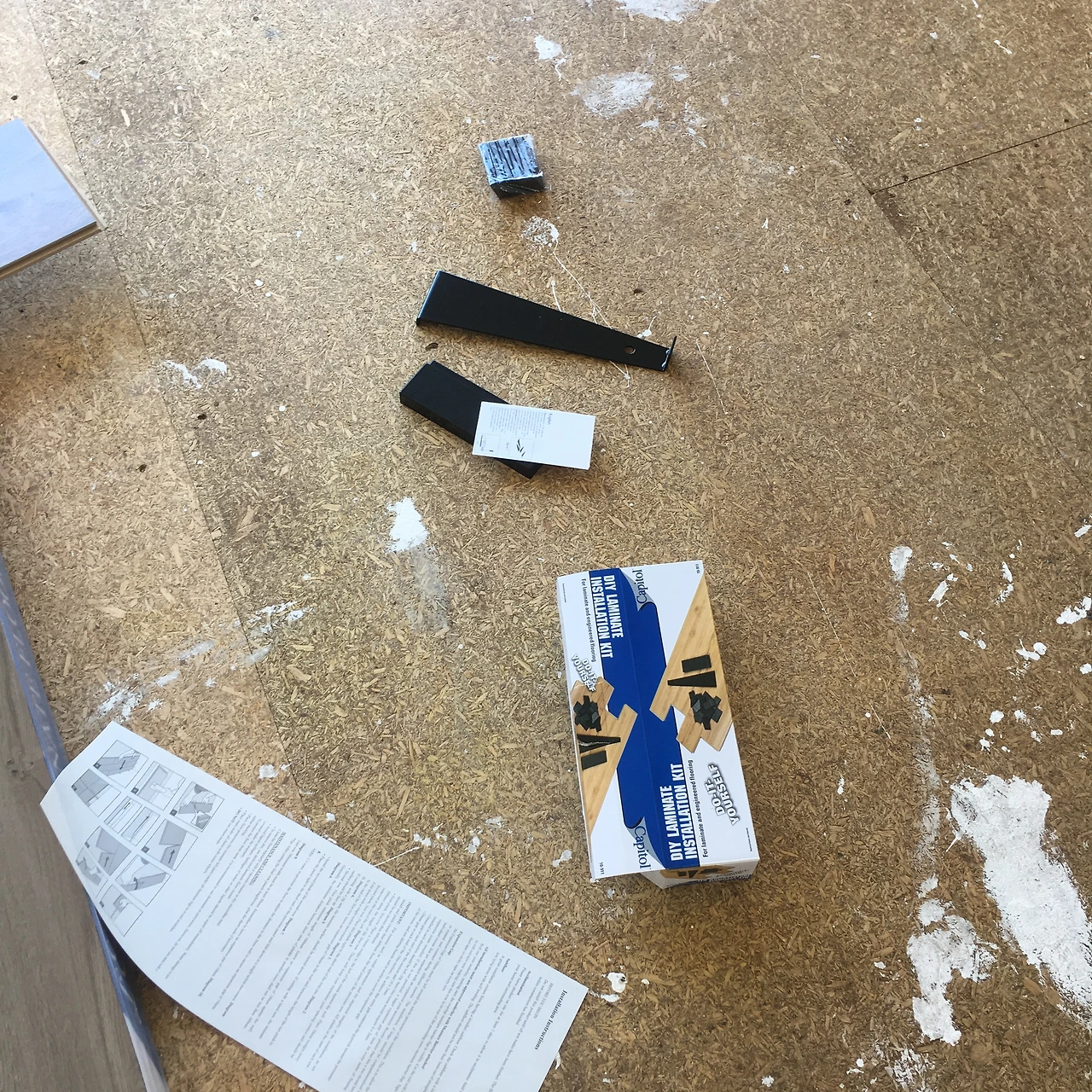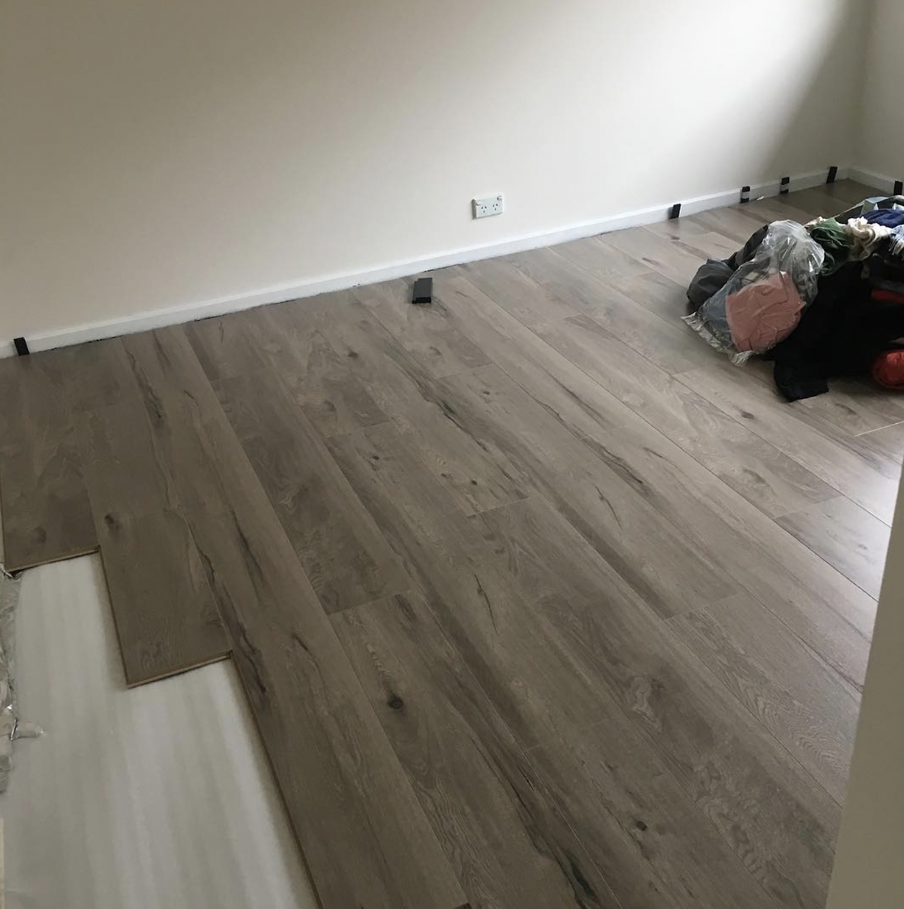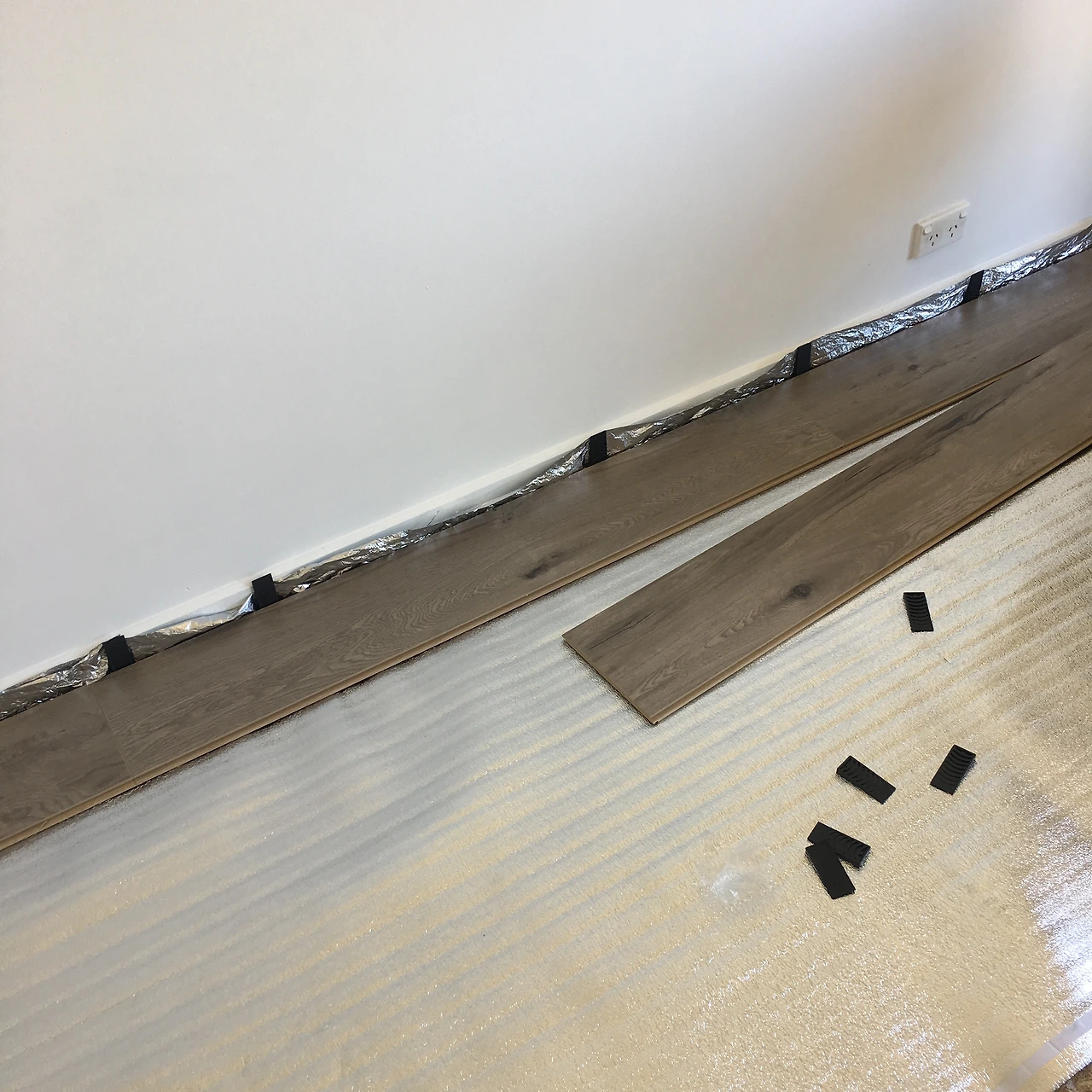 지내다 보면 바닥에 습기가 올라와서 래미네이트를 손상시킬 수 있기 때문에 깔기 전에 사진에 보이듯 바닥용 얇은 비닐을 먼저 깔아주어야 한다. 그리고 그 위에 래미네이트를 원하는 방향으로 한 줄씩 끼워 맞춰 넣는다.