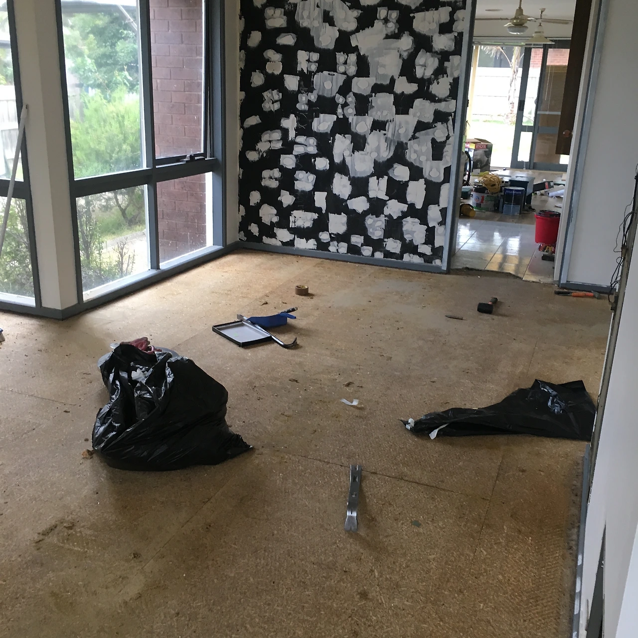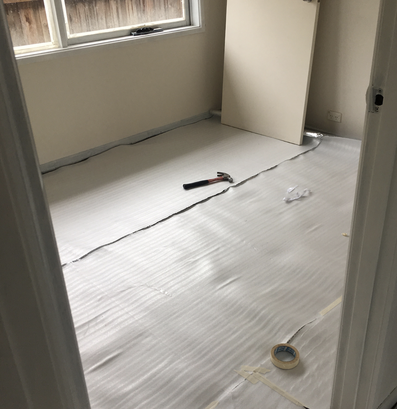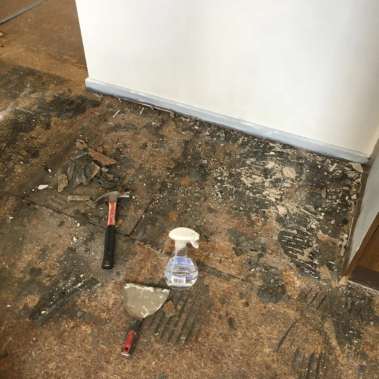 바닥도 다 뜯어내었다. 십 년도 더 묵은 듯한 카펫... 어디에 개 오줌이 묻었는지 뭔지 알 수 없는 지릿한 향을 머금은 카펫을 떼어내고 (사실 우린 구매 당시 카펫 밑에 나무가 깔려있는 줄 알고 샌딩만 한번 하려고 했는데, 나무가 깔려있지 않았다! 뒤통수... ㅂㄷㅂㄷ) 아직 바닥에 미련을 붙이고 남아있는 잔재들을 일일이 쭈그려 앉아서 끌로다 까냈다.
