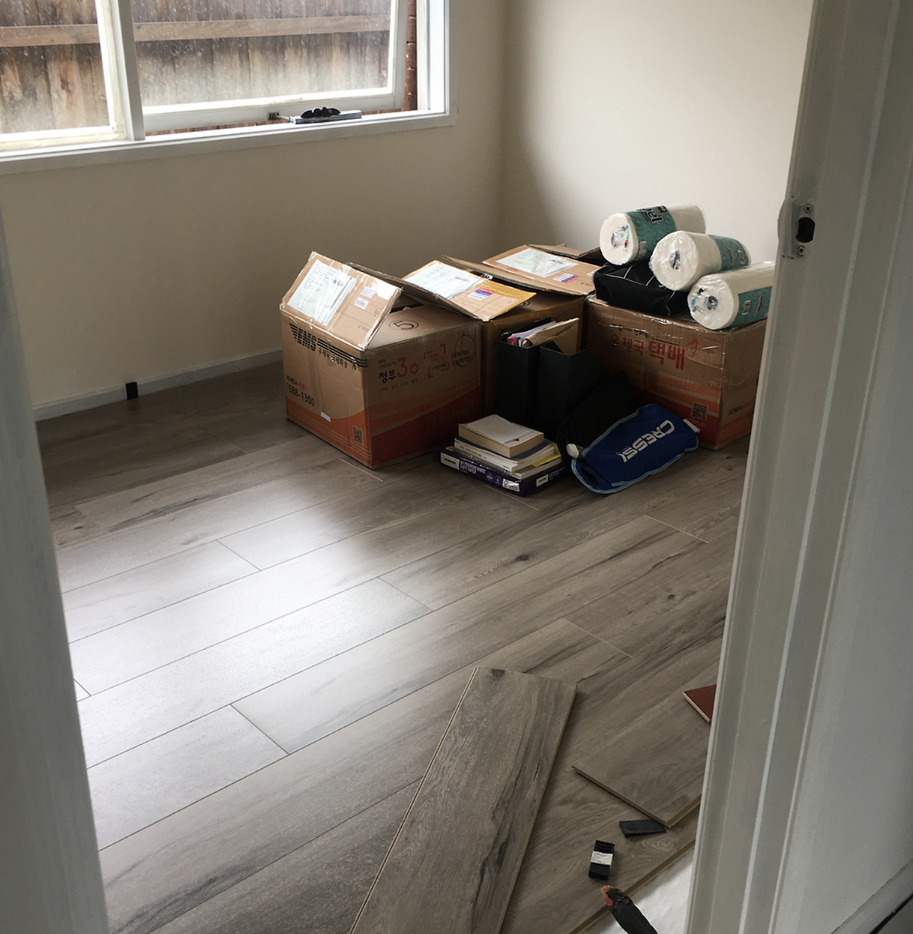 남편이 안방을 깔았고, 나는 남편 어깨너머로 배운 기술들로 나머지 방 2개를 직접 깔았다. 하다 보니 이거 뭐지? 나에게 이런 소질이 있다니! 싶을 정도로 너무 잘하는 것이 아닌가! 저 래미네이트를 방 길이에 맞춰서 중간중간 톱질도 해야 하는데, 직쏘도 다룰 줄 아는 나란 여자! 최고의 신붓감일세! 이렇게 자아도취되어 방 두 개를 뚝딱 깔았다. 그리고 그 사이에 주문했던 냉장고가 도착했다.